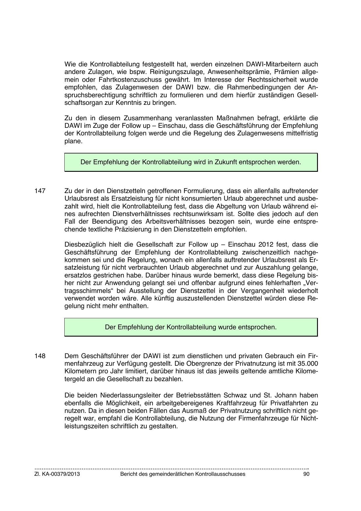 empfohlen, das Zulagenwesen der DAWI bzw. die Rahmenbedingungen der Anspruchsberechtigung schriftlich zu formulieren und dem hierfür zuständigen Gesellschaftsorgan zur Kenntnis zu bringen.