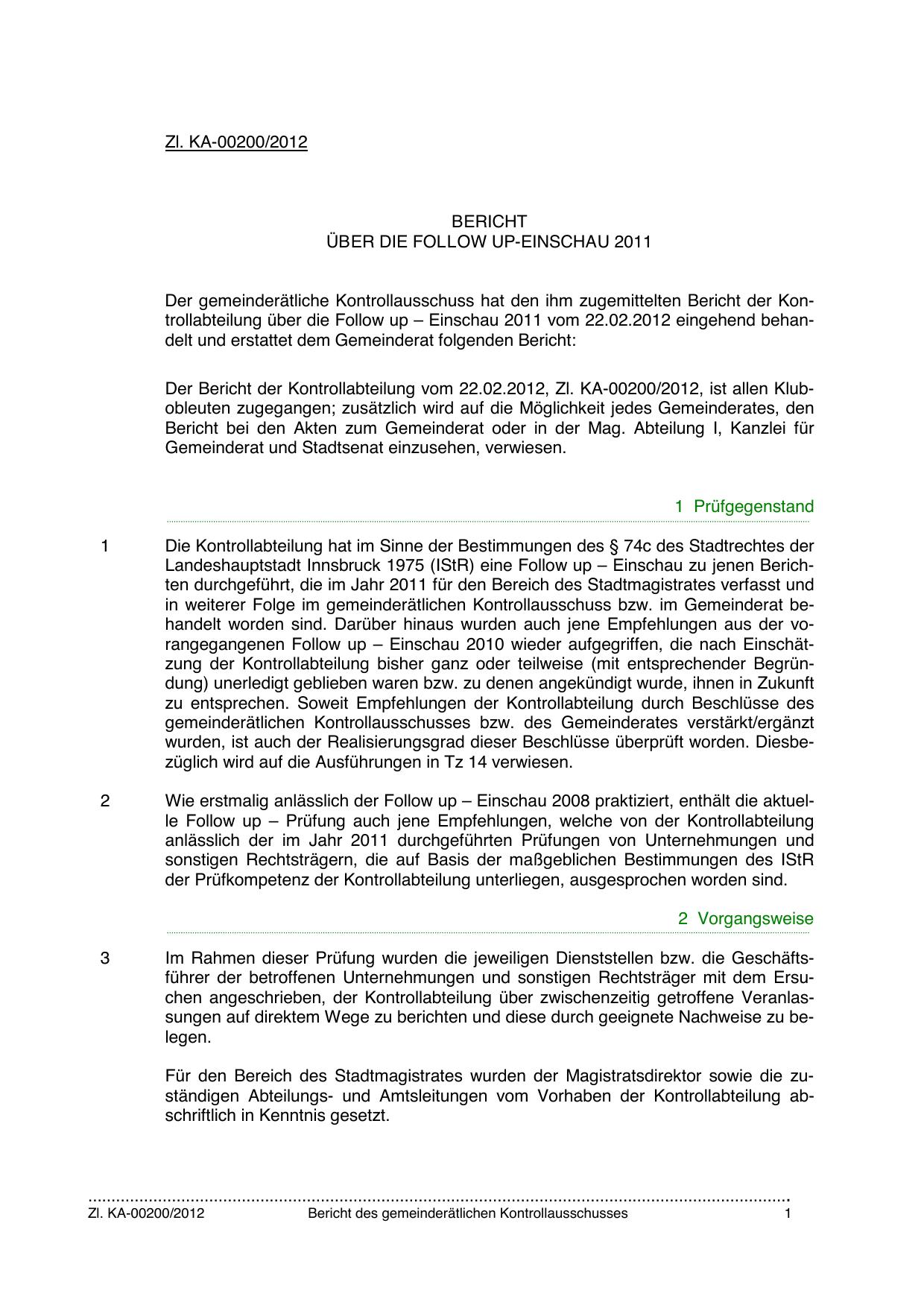 Landeshauptstadt Innsbruck 1975 (IStR) eine Follow up – Einschau zu jenen Berichten durchgeführt, die im Jahr 2011 für den Bereich des Stadtmagistrates verfasst und