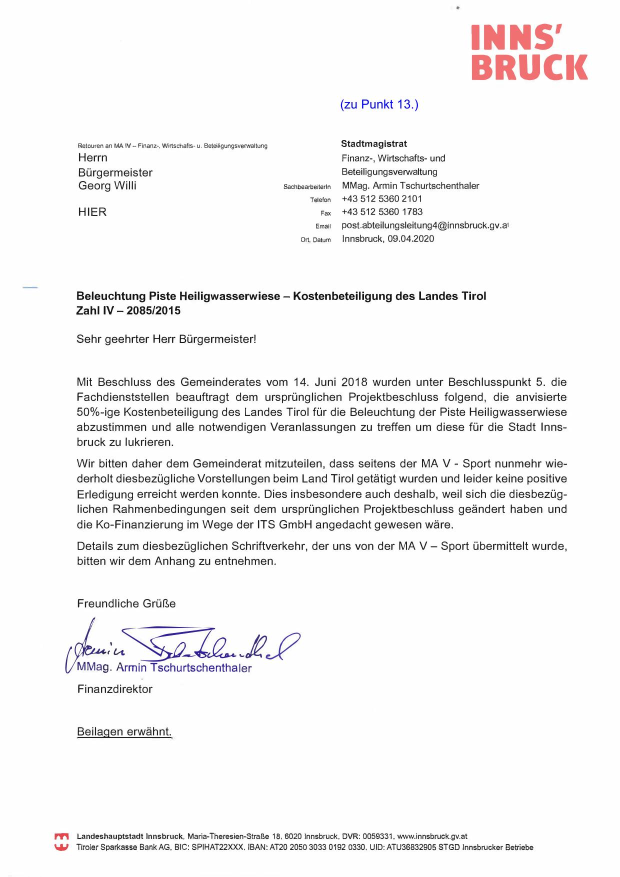 50%-ige Kostenbeteiligung des Landes Tirol für die Beleuchtung der Piste Heiligwasserwiese