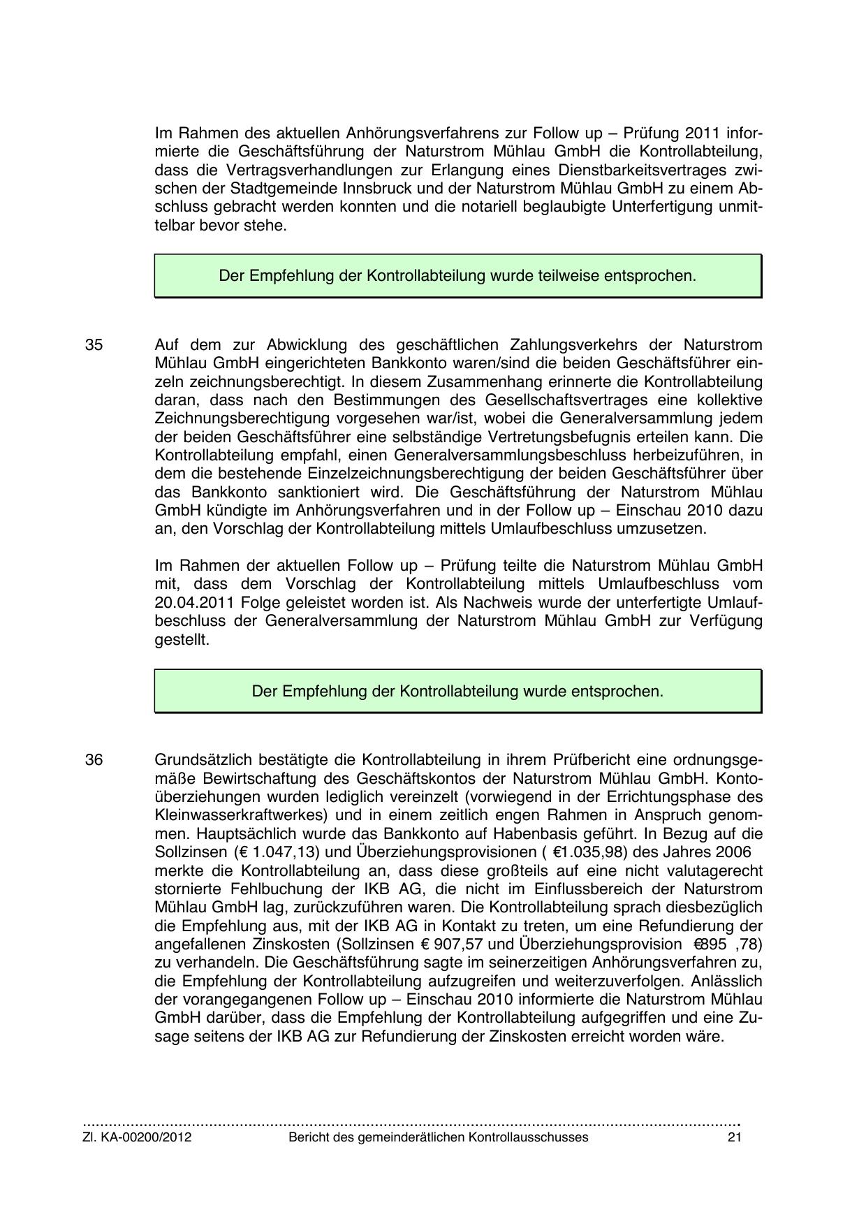 Grundsätzlich bestätigte die Kontrollabteilung in ihrem Prüfbericht eine ordnungsgemäße Bewirtschaftung des Geschäftskontos der Naturstrom Mühlau GmbH. Kontoüberziehungen wurden lediglich vereinzelt (vorwiegend in der Errichtungsphase des