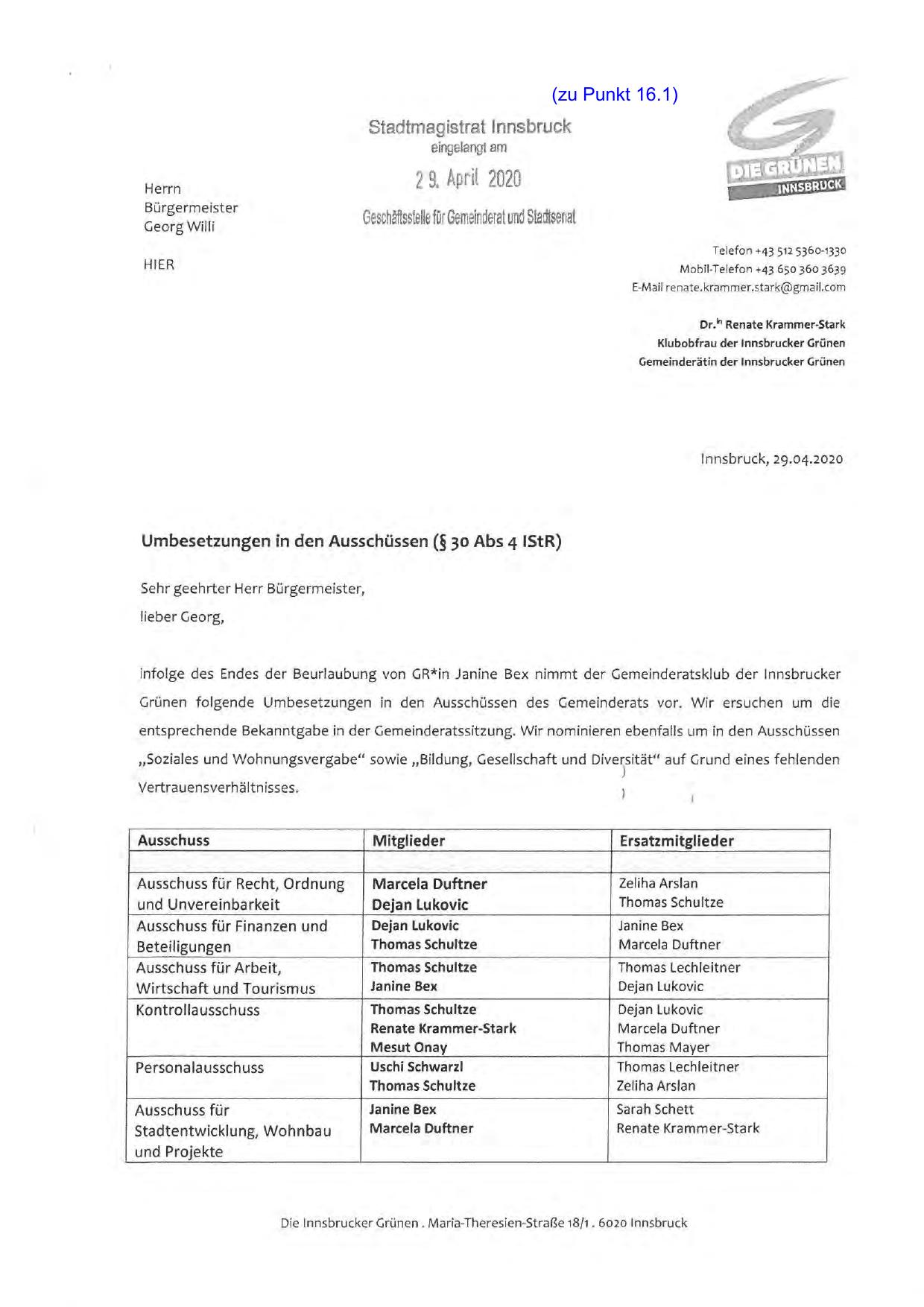 Grünen folgende Umbesetzungen in den Ausschüssen des Gemeinderats vor. Wir ersuchen um die