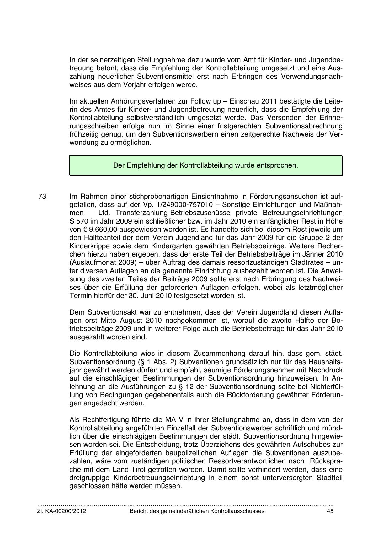 In der seinerzeitigen Stellungnahme dazu wurde vom Amt für Kinder- und Jugendbetreuung betont, dass die Empfehlung der Kontrollabteilung umgesetzt und eine Auszahlung neuerlicher Subventionsmittel erst nach Erbringen des Verwendungsnachweises aus dem Vorjahr erfolgen werde.
