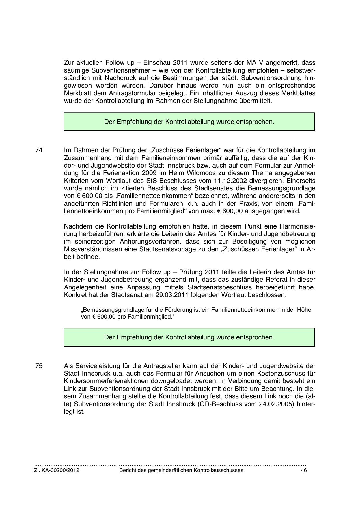 Link zur Subventionsordnung der Stadt Innsbruck mit der Bitte um Beachtung. In diesem Zusammenhang stellte die Kontrollabteilung fest, dass diesem Link noch die (alte) Subventionsordnung der Stadt Innsbruck (GR-Beschluss vom 24.02.2005) hinterlegt ist.