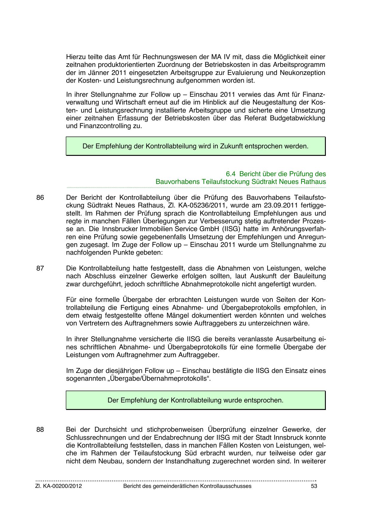 regte in manchen Fällen Überlegungen zur Verbesserung stetig auftretender Prozesse an. Die Innsbrucker Immobilien Service GmbH (IISG) hatte im Anhörungsverfahren eine Prüfung sowie gegebenenfalls Umsetzung der Empfehlungen und Anregungen zugesagt. Im Zuge der Follow up – Einschau 2011 wurde um Stellungnahme zu