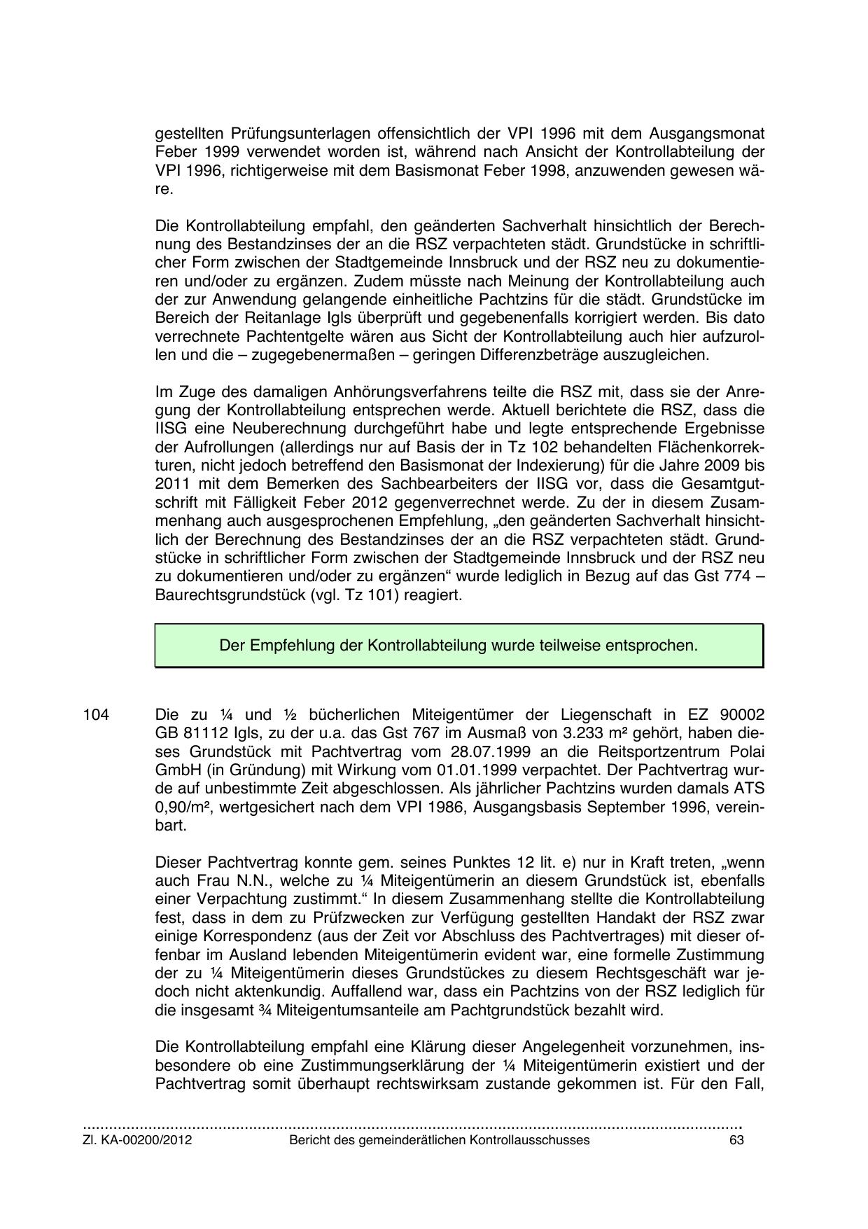 2011 mit dem Bemerken des Sachbearbeiters der IISG vor, dass die Gesamtgutschrift mit Fälligkeit Feber 2012 gegenverrechnet werde. Zu der in diesem Zusammenhang auch ausgesprochenen Empfehlung, „den geänderten Sachverhalt hinsichtlich der Berechnung des Bestandzinses der an die RSZ verpachteten städt. Grundstücke in schriftlicher Form zwischen der Stadtgemeinde Innsbruck und der RSZ neu