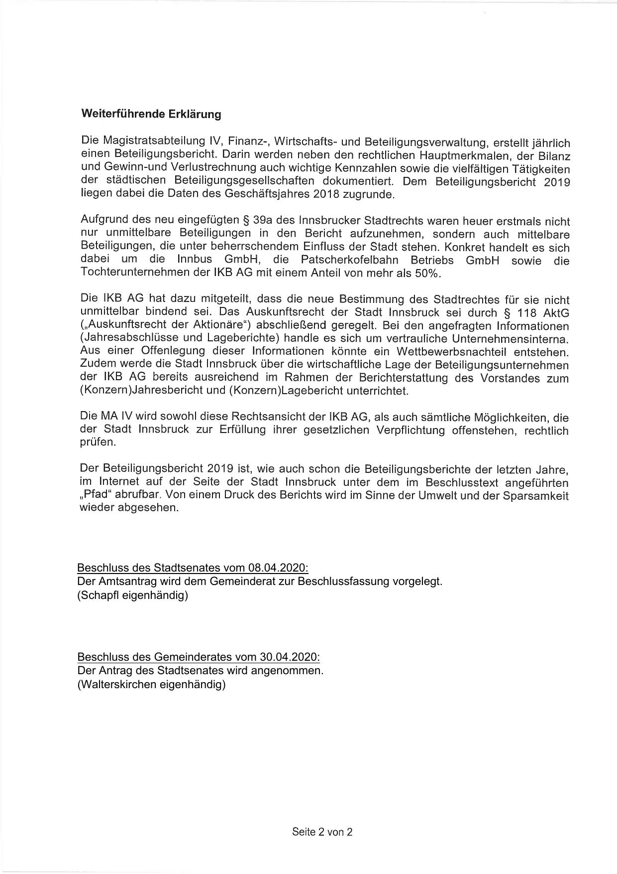 Zudem werde die Stadt Innsbruck über die wirtschaftliche Lage der Beteiligungsunternehmen