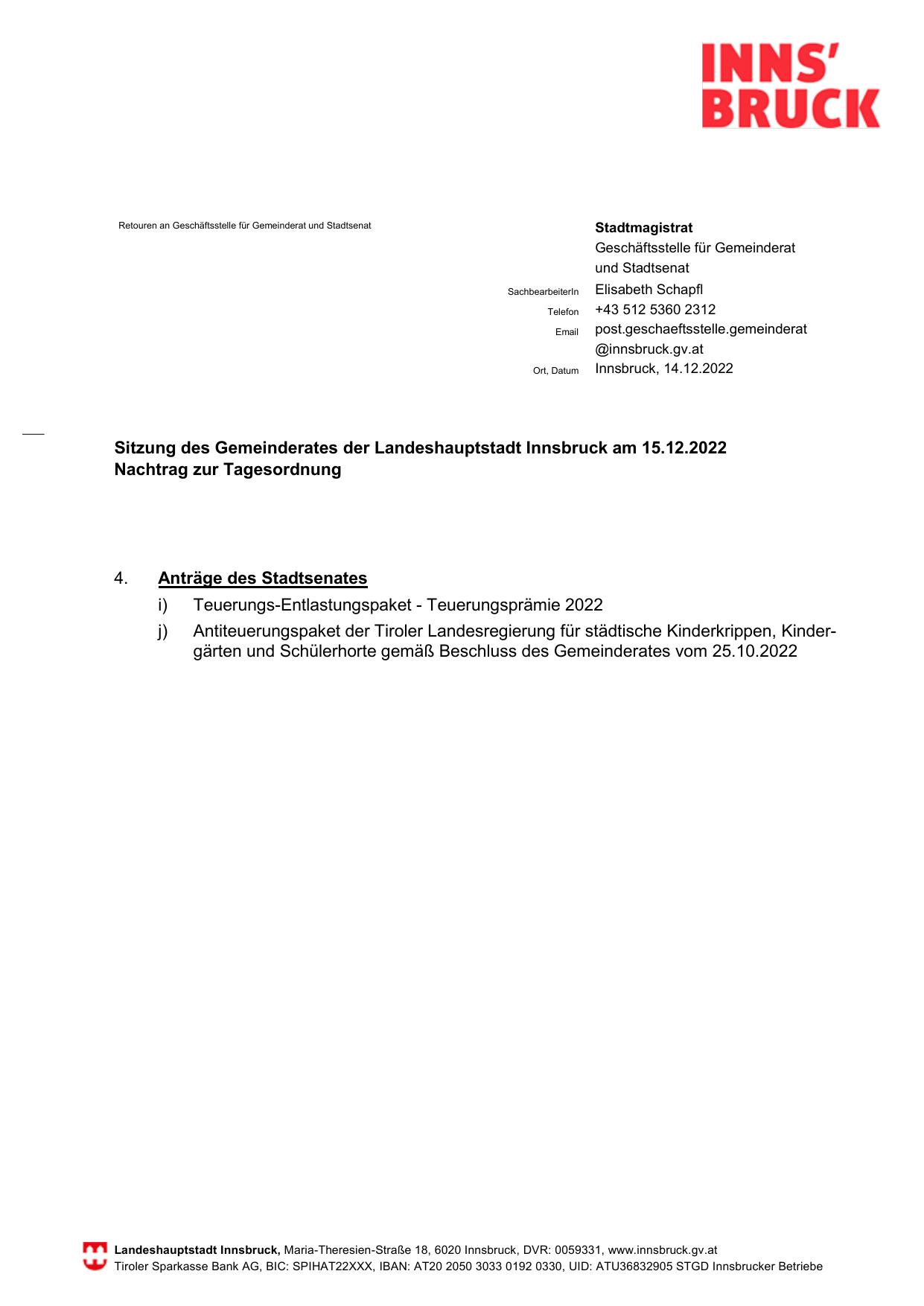Sitzung des Gemeinderates der Landeshauptstadt Innsbruck am 15.12.2022