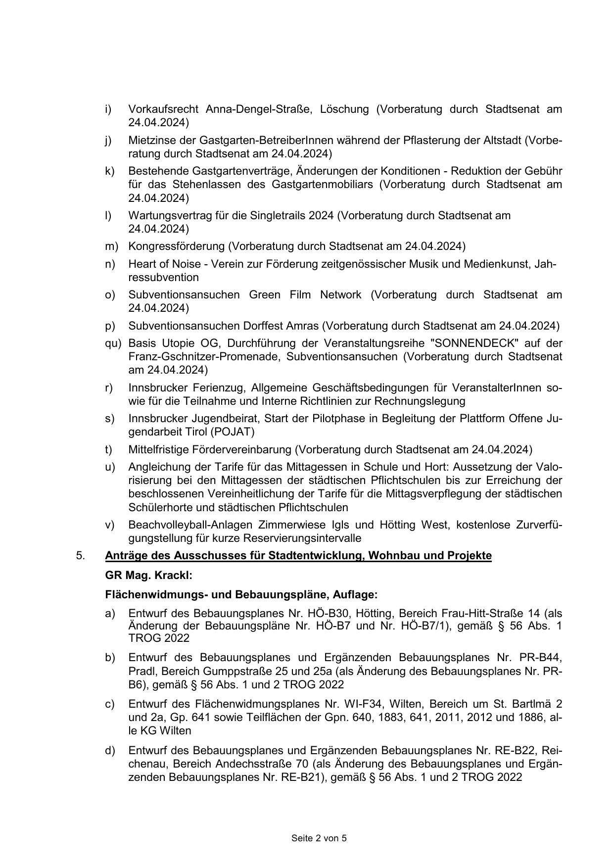 Anträge des Ausschusses für Stadtentwicklung, Wohnbau und Projekte