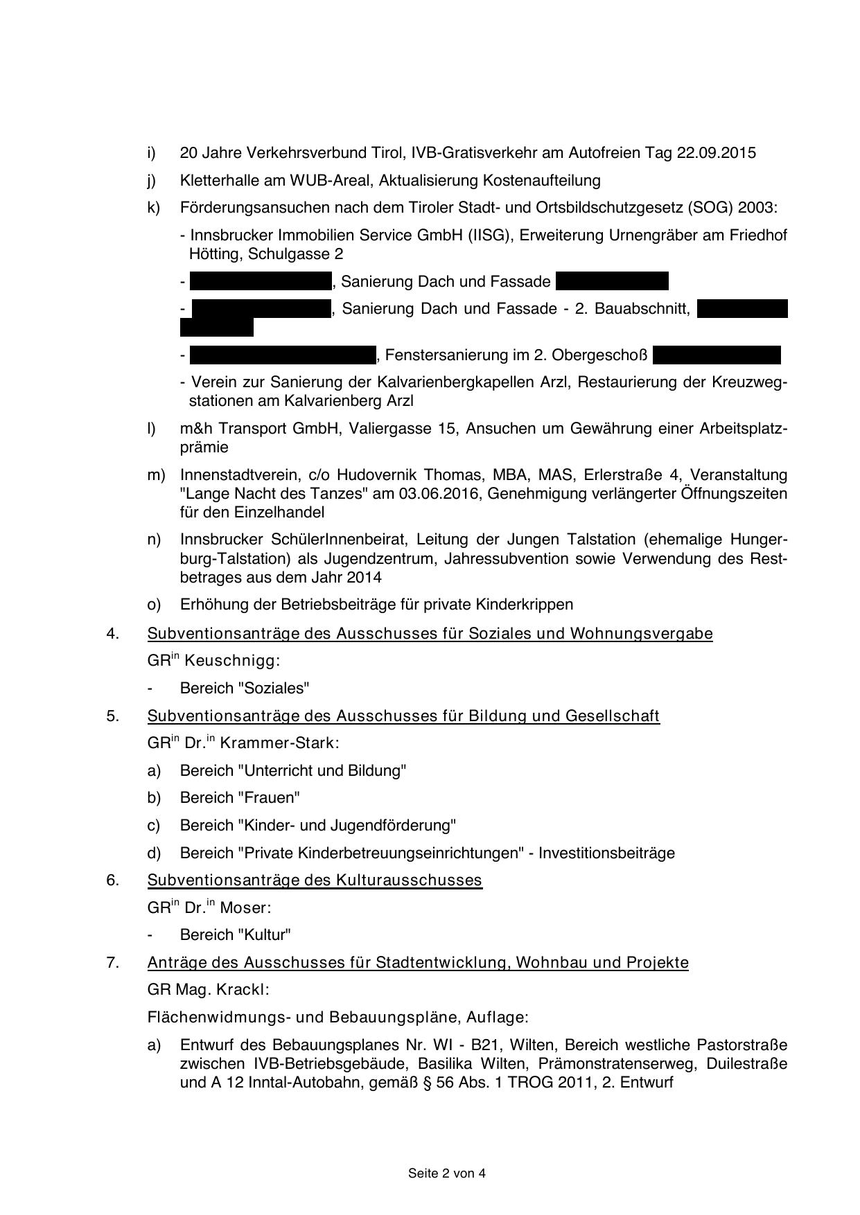 Anträge des Ausschusses für Stadtentwicklung, Wohnbau und Projekte