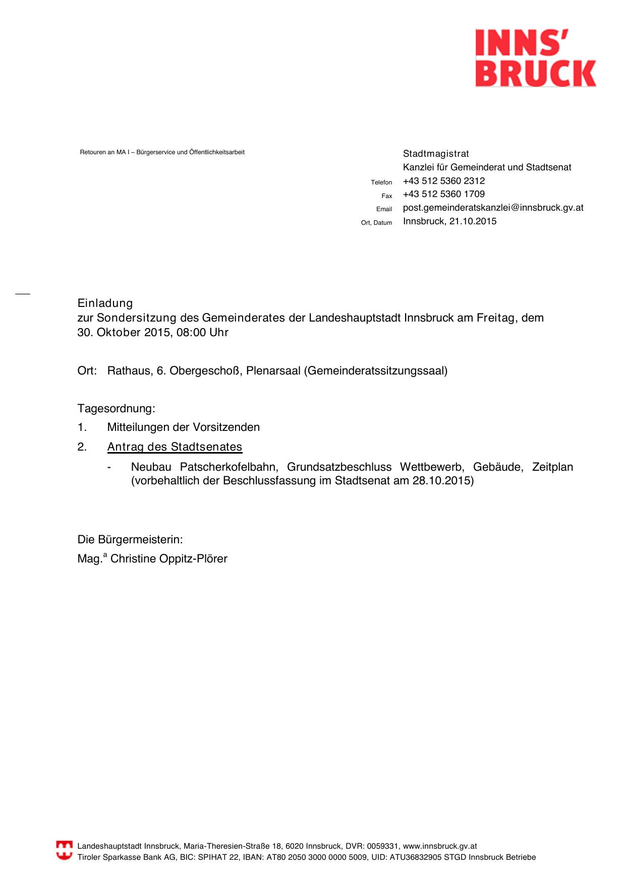zur Sondersitzung des Gemeinderates der Landeshauptstadt Innsbruck am Freitag, dem