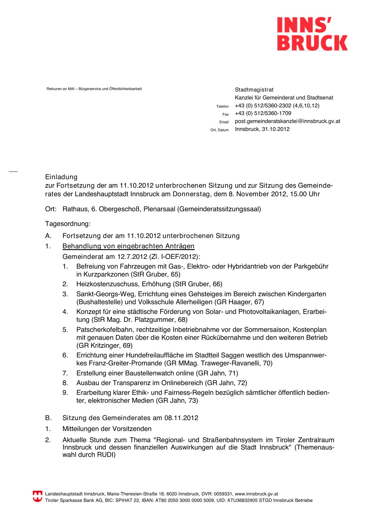 zur Fortsetzung der am 11.10.2012 unterbrochenen Sitzung und zur Sitzung des Gemeinderates der Landeshauptstadt Innsbruck am Donnerstag, dem 8. November 2012, 15.00 Uhr