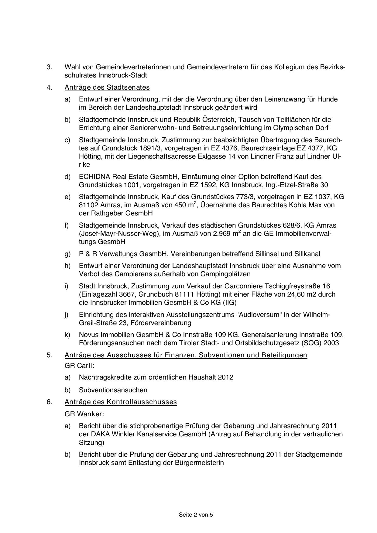 Stadt Innsbruck, Zustimmung zum Verkauf der Garconniere Tschiggfreystraße 16
