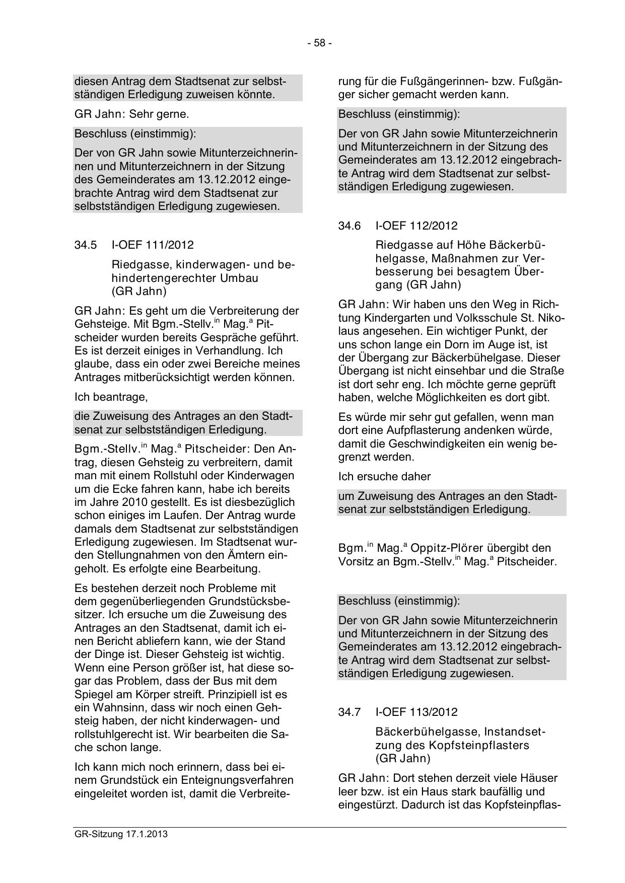 des Gemeinderates am 13.12.2012 eingebrachte Antrag wird dem Stadtsenat zur