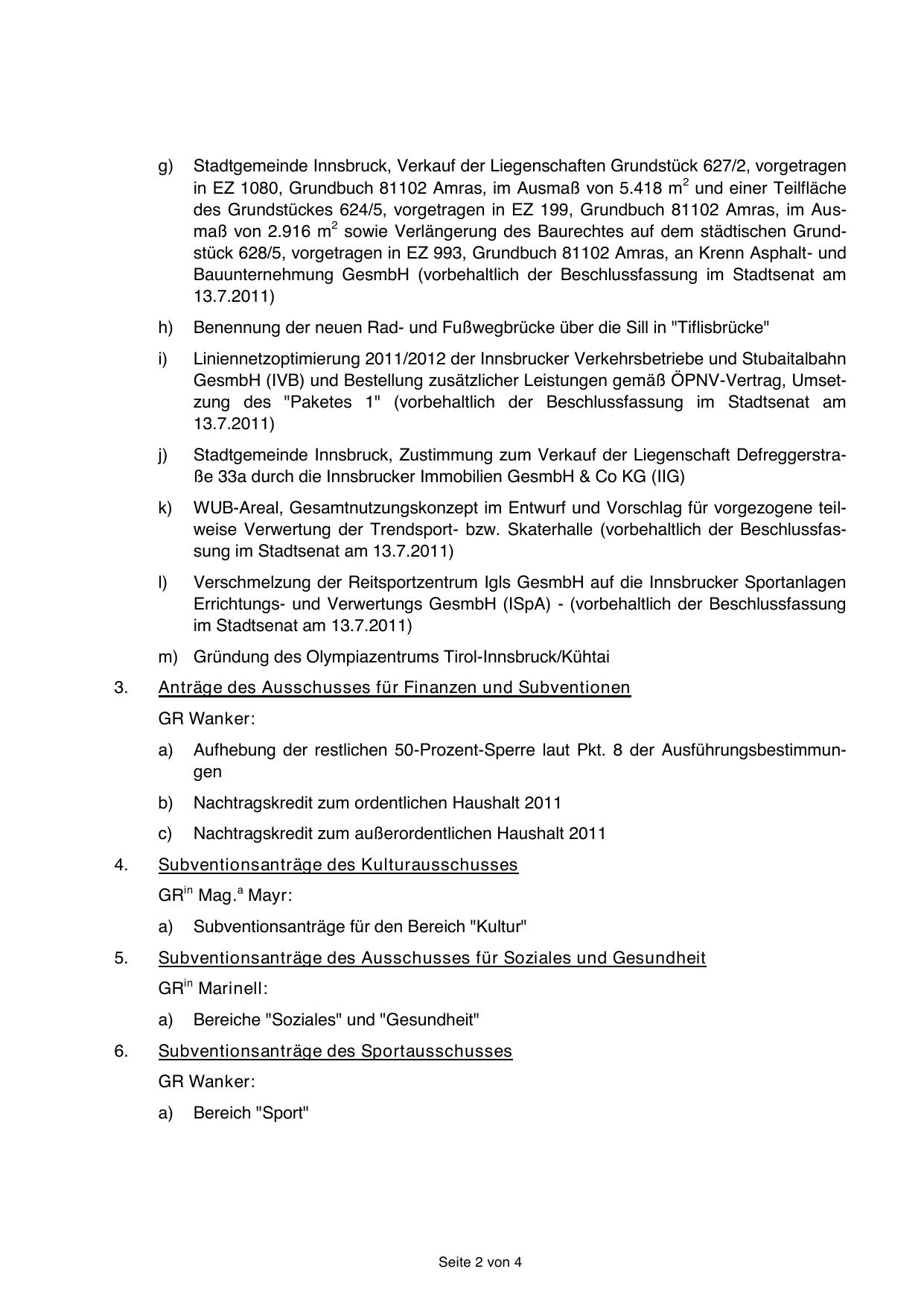 Stadtgemeinde Innsbruck, Verkauf der Liegenschaften Grundstück 627/2, vorgetragen