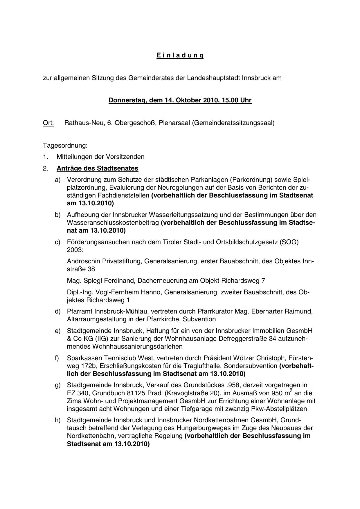 zur allgemeinen Sitzung des Gemeinderates der Landeshauptstadt Innsbruck am