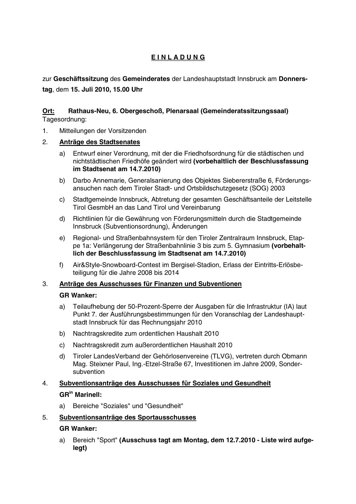 zur Geschäftssitzung des Gemeinderates der Landeshauptstadt Innsbruck am Donnerstag, dem 15. Juli 2010, 15.00 Uhr