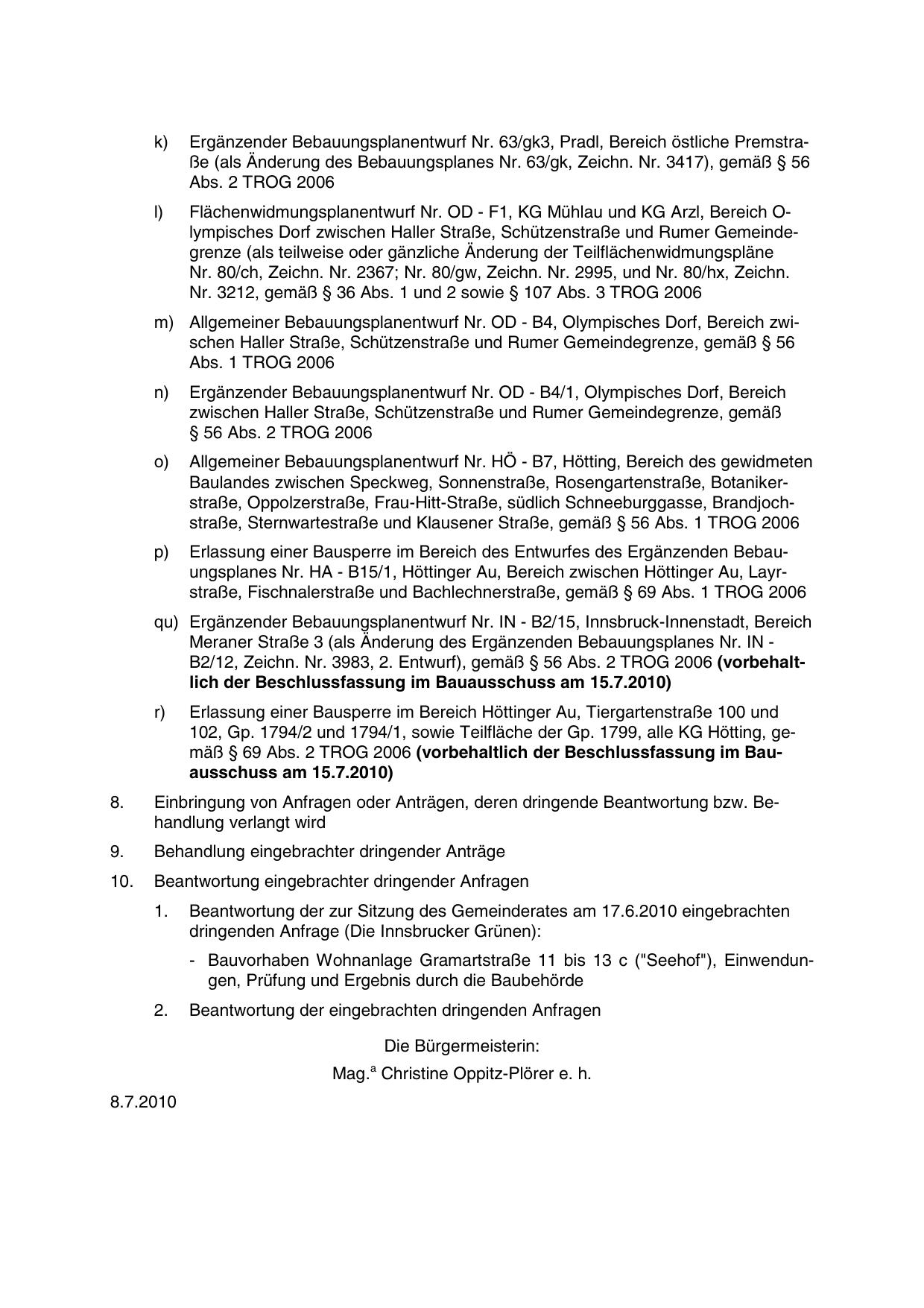 102, Gp. 1794/2 und 1794/1, sowie Teilfläche der Gp. 1799, alle KG Hötting, gemäß § 69 Abs. 2 TROG 2006 (vorbehaltlich der Beschlussfassung im Bauausschuss am 15.7.2010)
