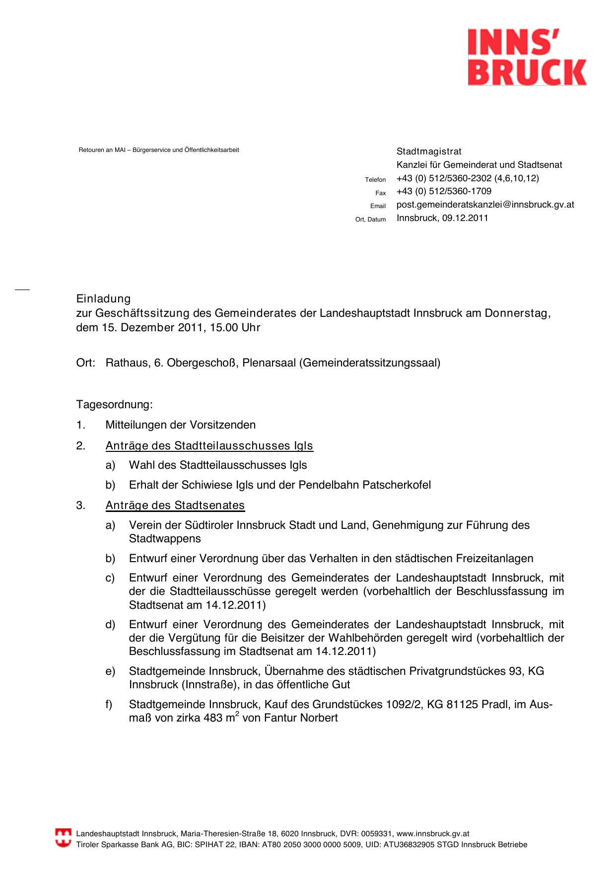 zur Geschäftssitzung des Gemeinderates der Landeshauptstadt Innsbruck am Donnerstag,
