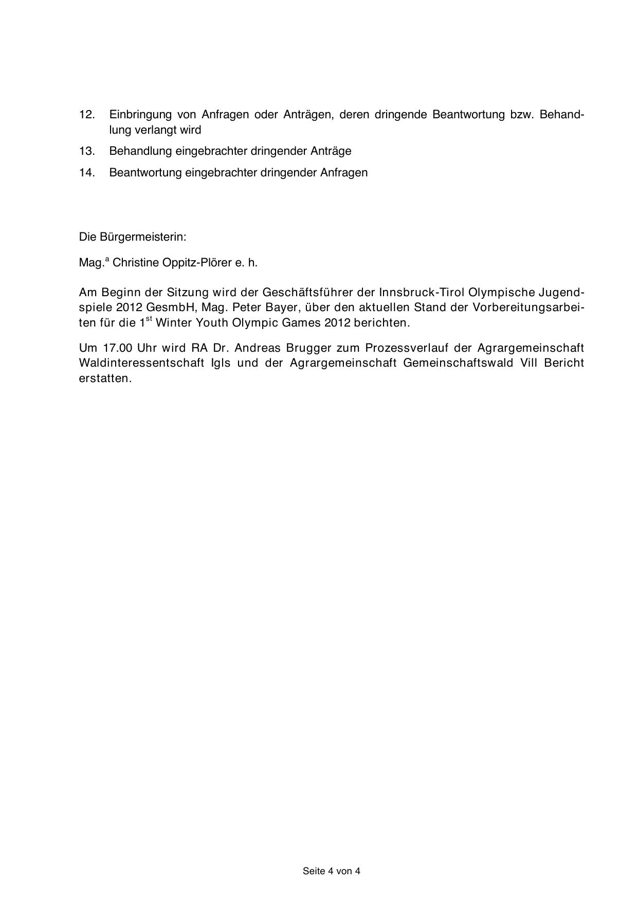 Am Beginn der Sitzung wird der Geschäftsführer der Innsbruck-Tirol Olympische Jugendspiele 2012 GesmbH, Mag. Peter Bayer, über den aktuellen Stand der Vorbereitungsarbeiten für die 1st Winter Youth Olympic Games 2012 berichten.