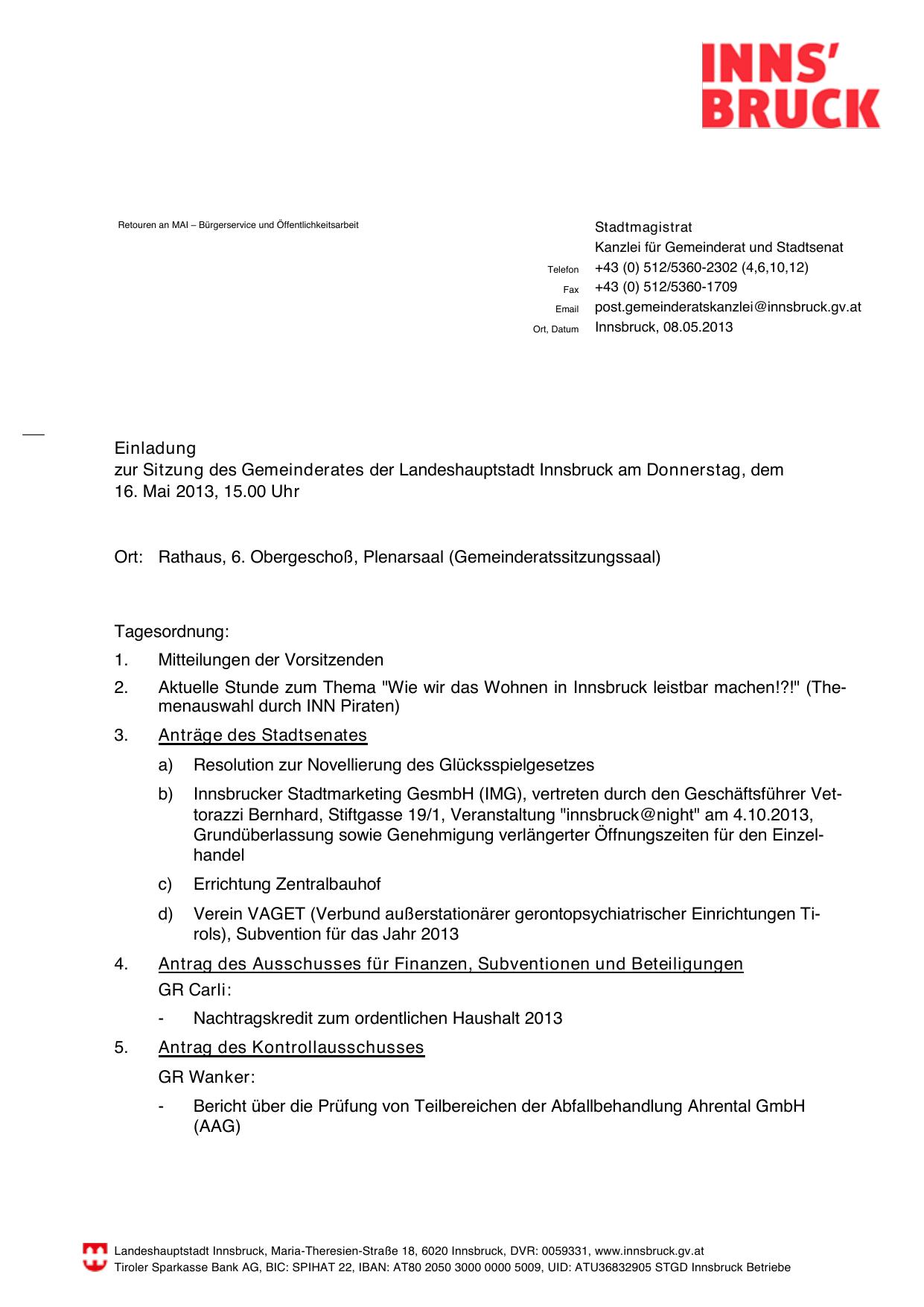 zur Sitzung des Gemeinderates der Landeshauptstadt Innsbruck am Donnerstag, dem