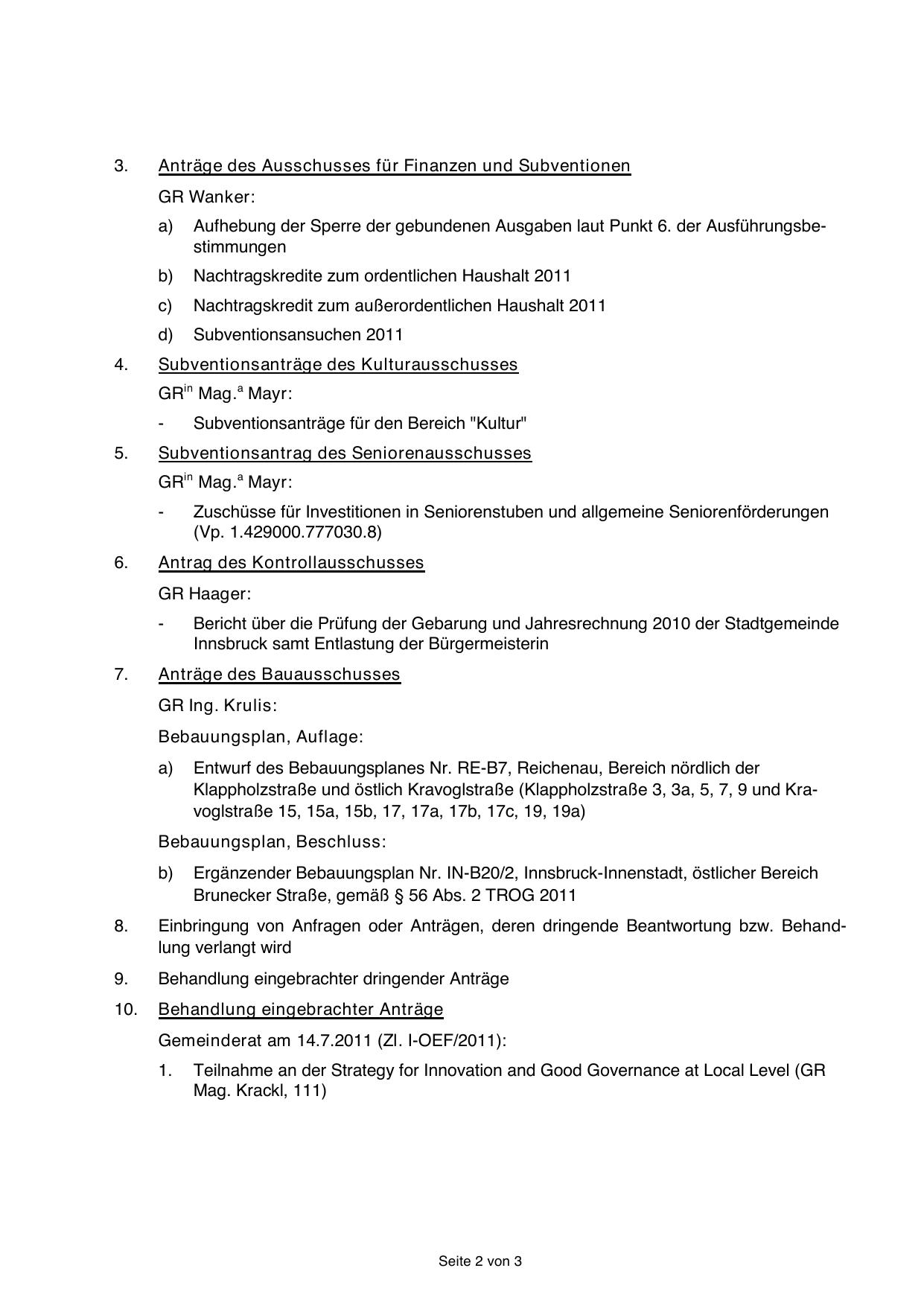 Gemeinderat am 14.7.2011 (Zl. I-OEF/2011):