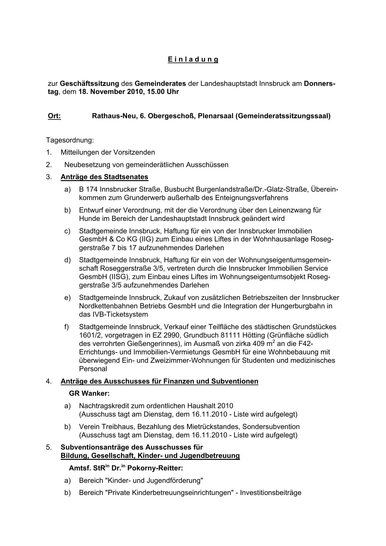 zur Geschäftssitzung des Gemeinderates der Landeshauptstadt Innsbruck am Donnerstag, dem 18. November 2010, 15.00 Uhr
