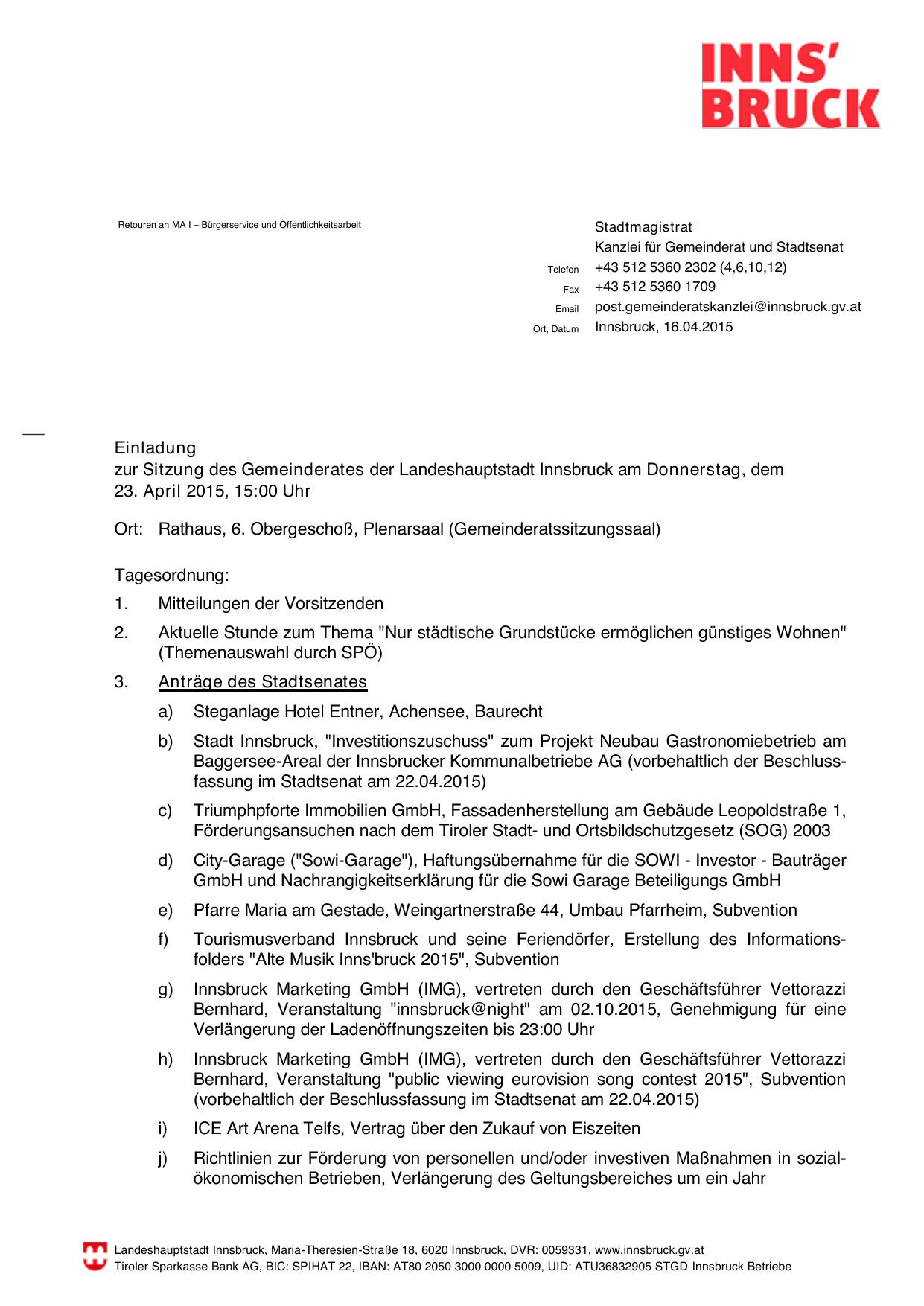 zur Sitzung des Gemeinderates der Landeshauptstadt Innsbruck am Donnerstag, dem