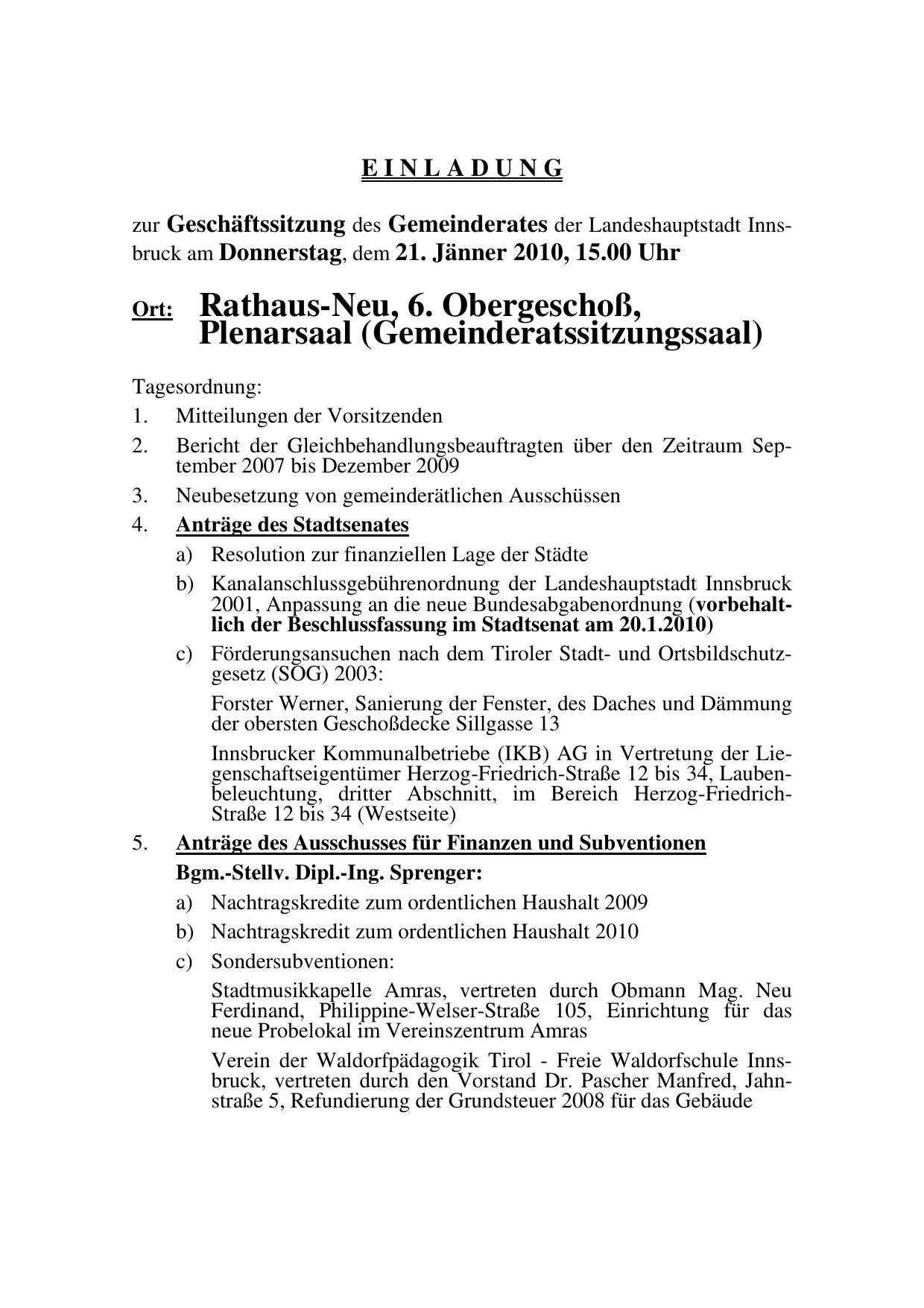zur Geschäftssitzung des Gemeinderates der Landeshauptstadt Innsbruck am Donnerstag, dem 21. Jänner 2010, 15.00 Uhr