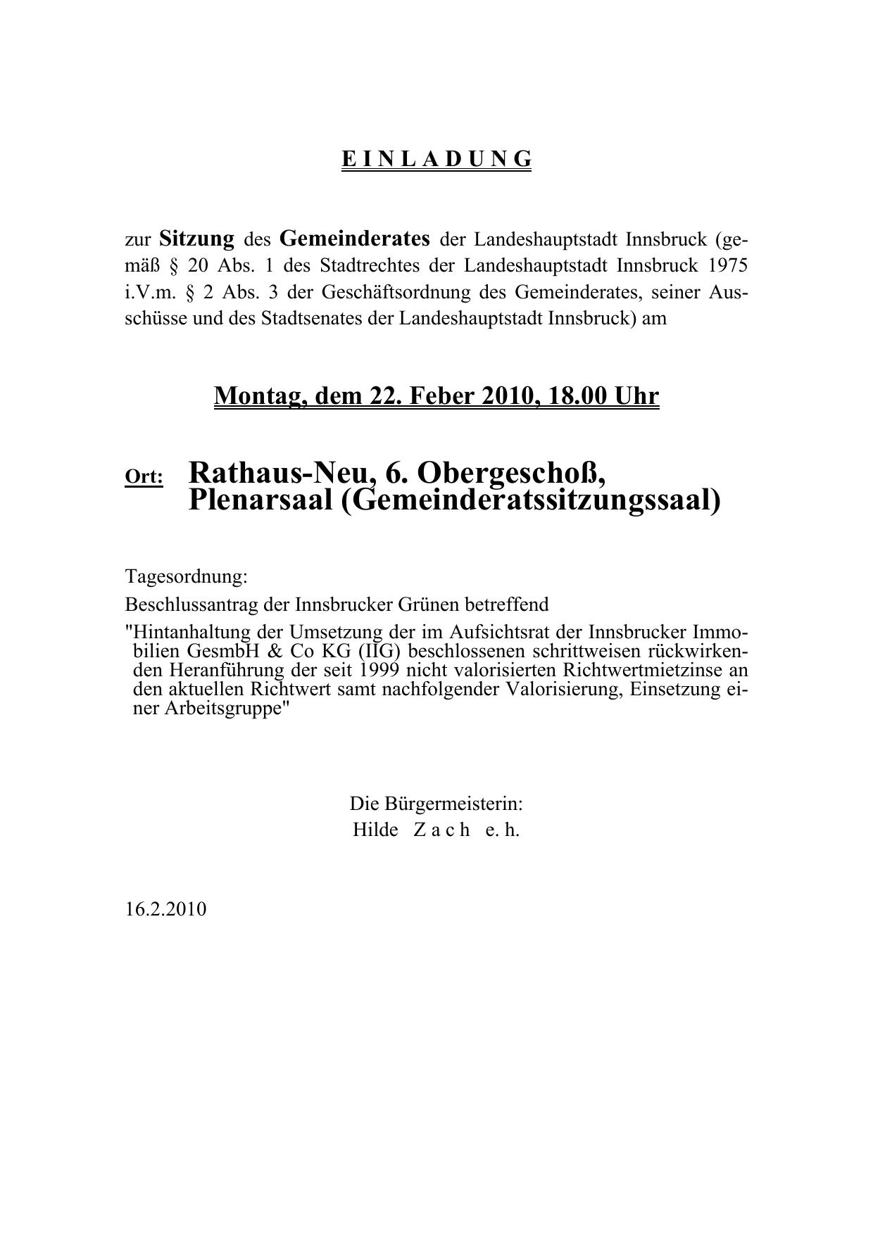"Hintanhaltung der Umsetzung der im Aufsichtsrat der Innsbrucker Immobilien GesmbH & Co KG (IIG) beschlossenen schrittweisen rückwirkenden Heranführung der seit 1999 nicht valorisierten Richtwertmietzinse an