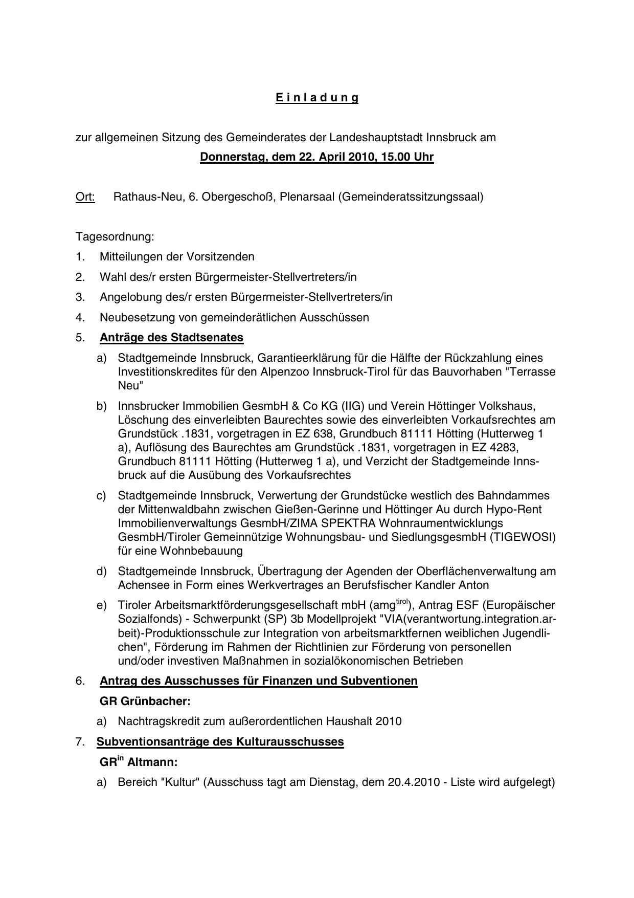 zur allgemeinen Sitzung des Gemeinderates der Landeshauptstadt Innsbruck am