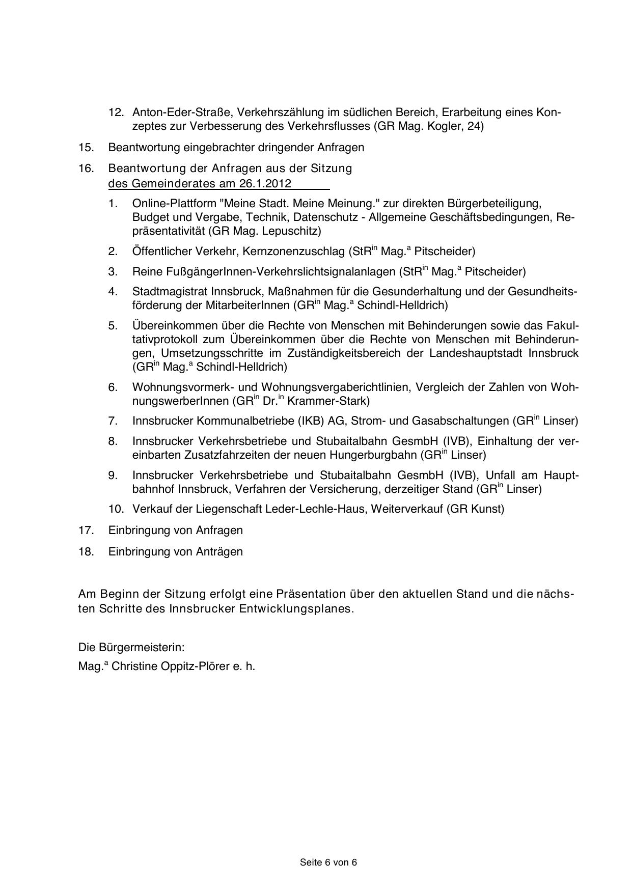 Am Beginn der Sitzung erfolgt eine Präsentation über den aktuellen Stand und die nächsten Schritte des Innsbrucker Entwicklungsplanes.