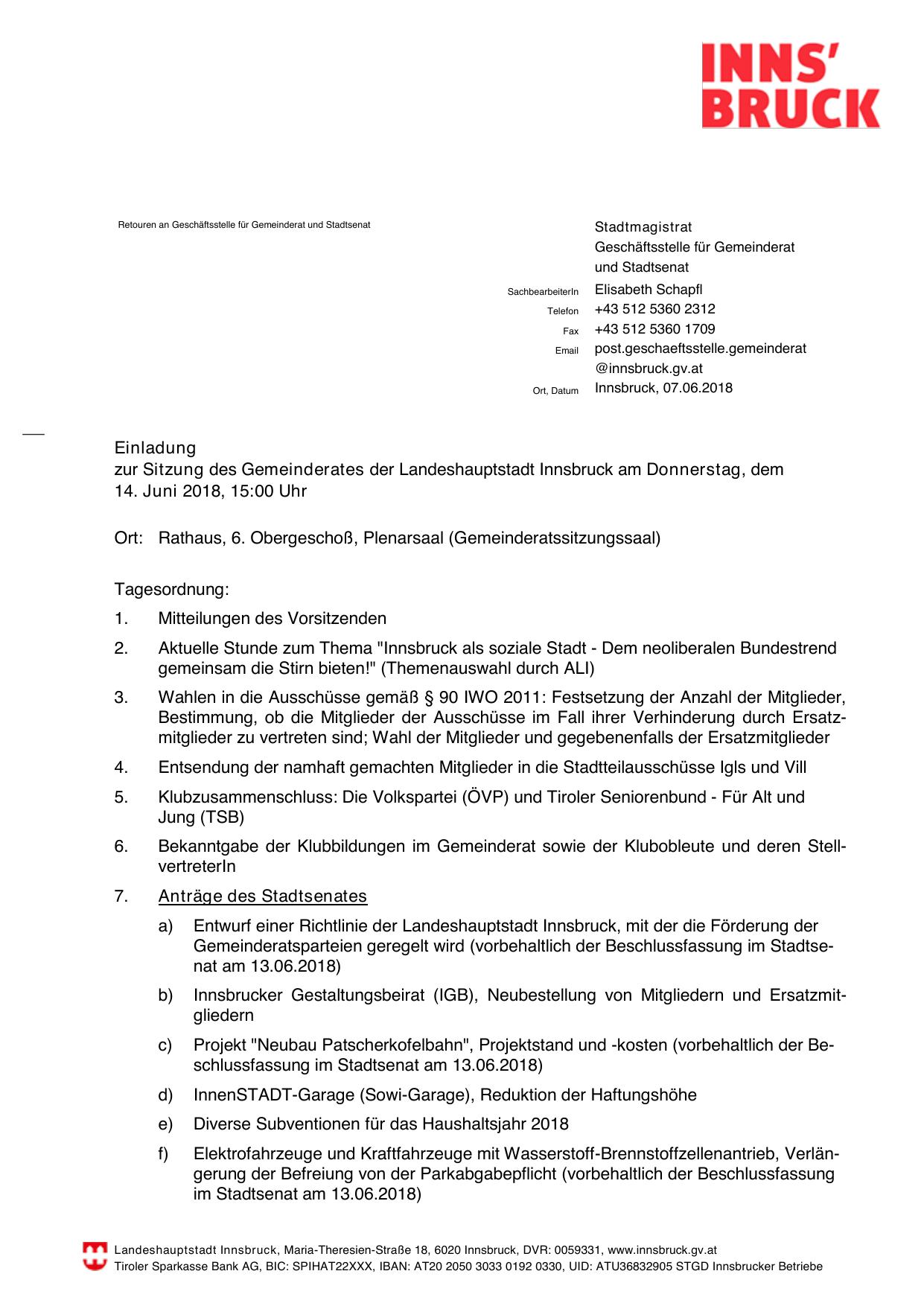 zur Sitzung des Gemeinderates der Landeshauptstadt Innsbruck am Donnerstag, dem