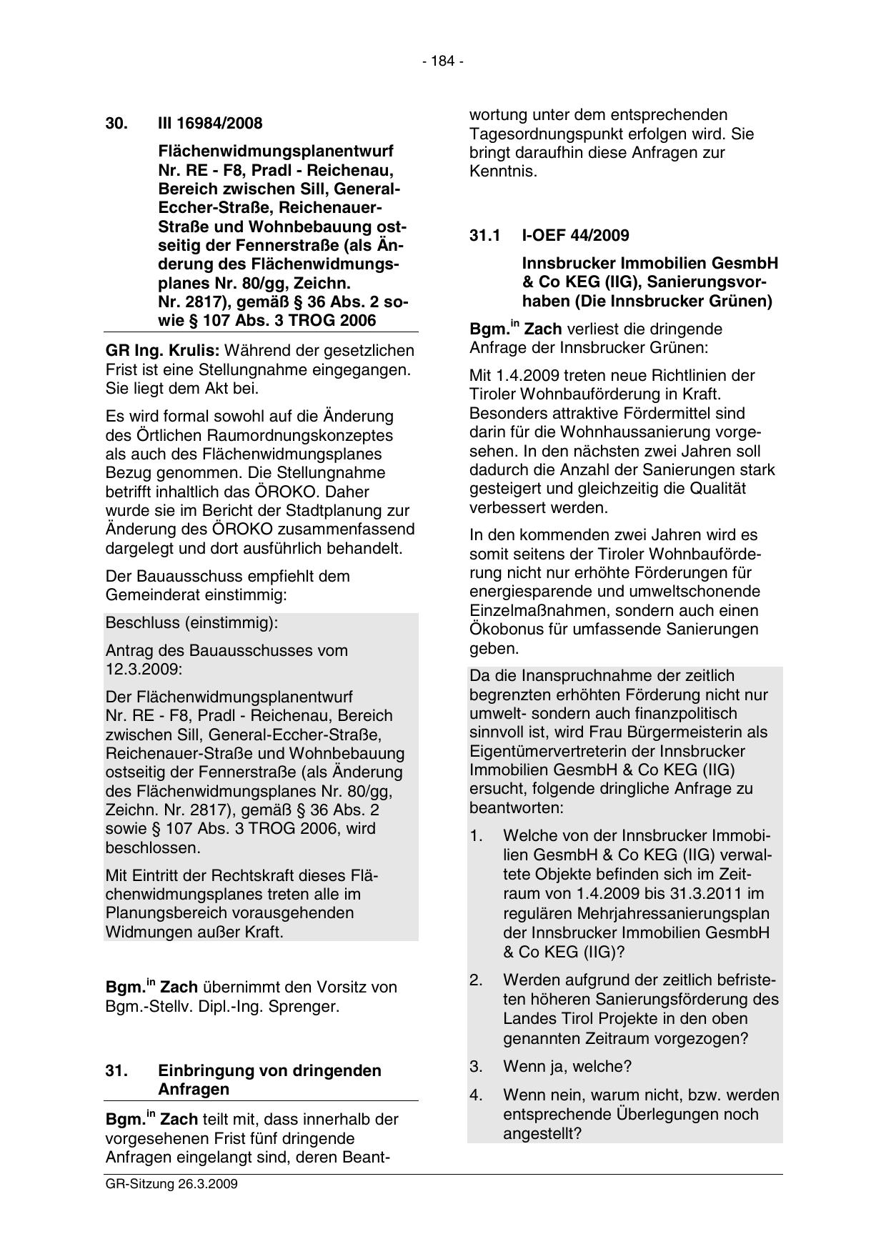Bereich zwischen Sill, GeneralEccher-Straße, ReichenauerStraße und Wohnbebauung ostseitig der Fennerstraße (als Änderung des Flächenwidmungsplanes Nr. 80/gg, Zeichn.