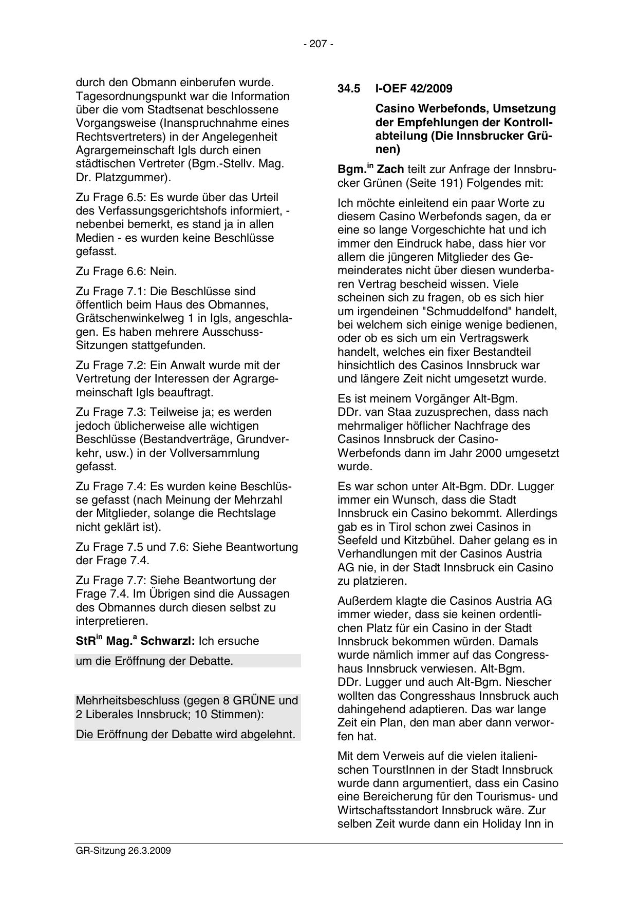 Bgm.in Zach teilt zur Anfrage der Innsbrucker Grünen (Seite 191) Folgendes mit: