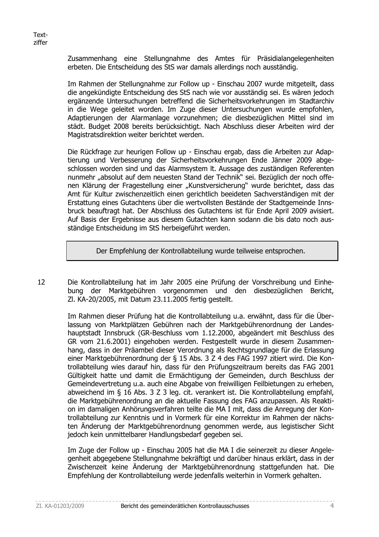 Erstattung eines Gutachtens über die wertvollsten Bestände der Stadtgemeinde Innsbruck beauftragt hat. Der Abschluss des Gutachtens ist für Ende April 2009 avisiert.