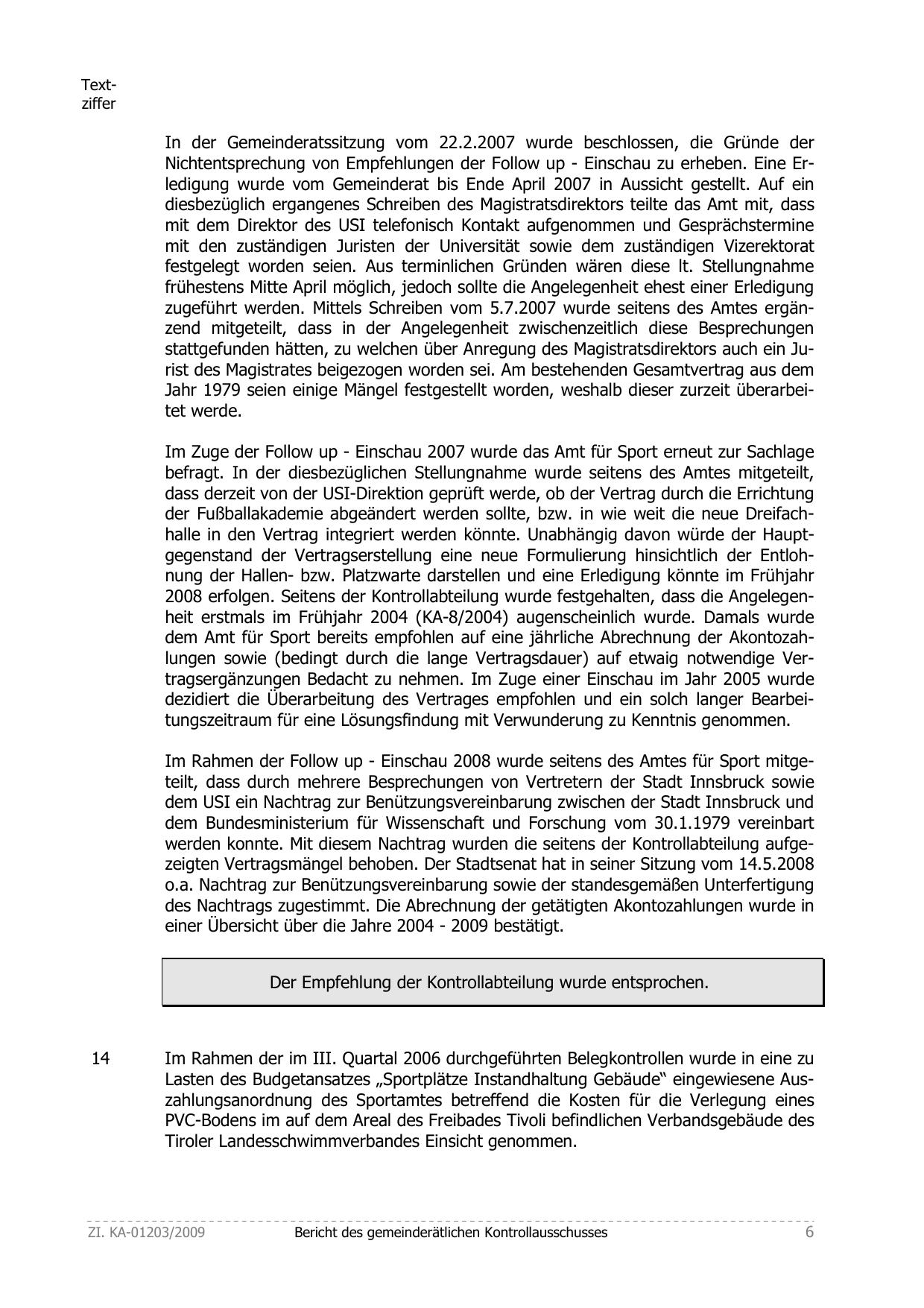 Im Rahmen der Follow up - Einschau 2008 wurde seitens des Amtes für Sport mitgeteilt, dass durch mehrere Besprechungen von Vertretern der Stadt Innsbruck sowie