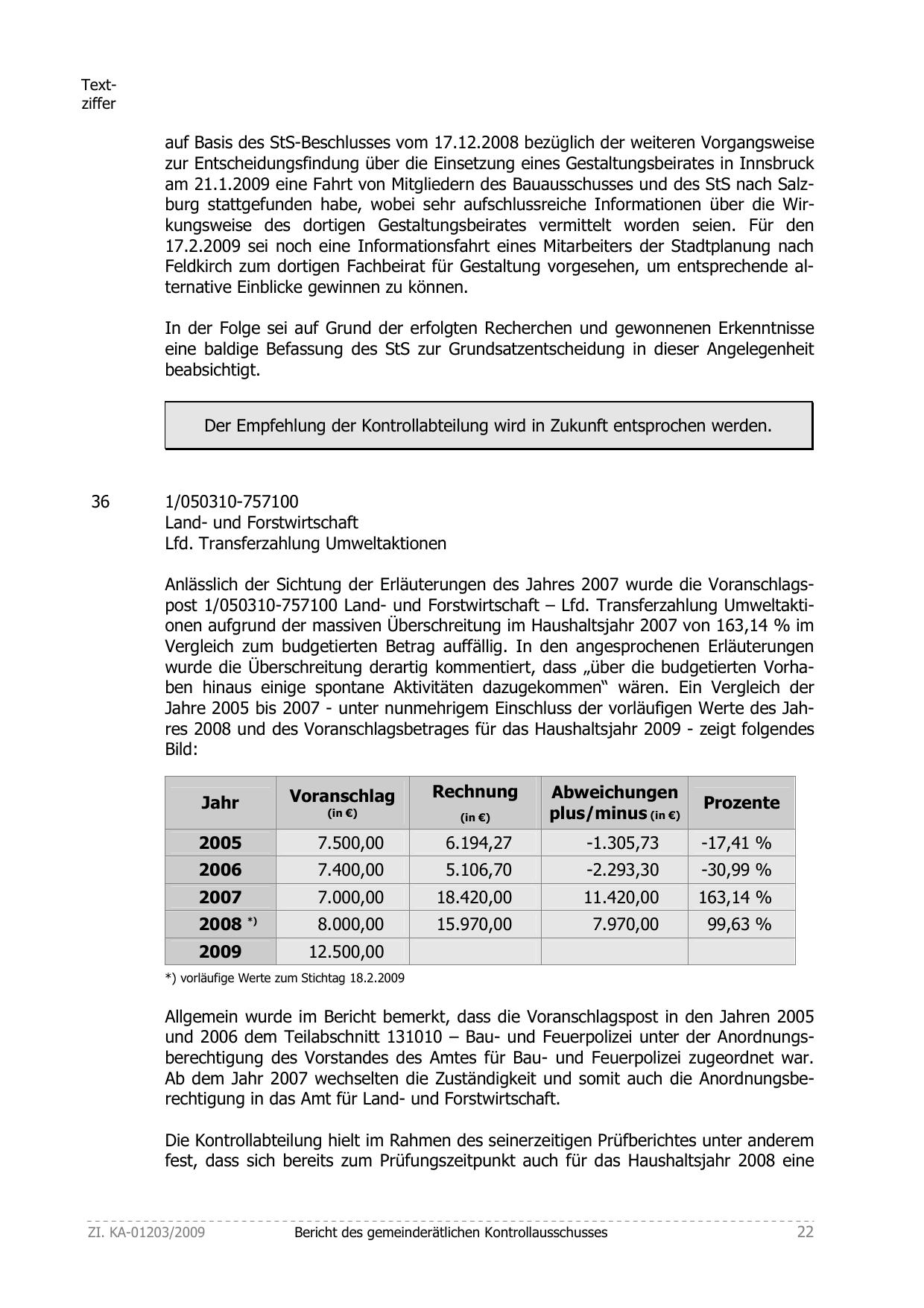 Anlässlich der Sichtung der Erläuterungen des Jahres 2007 wurde die Voranschlagspost 1/050310-757100 Land- und Forstwirtschaft – Lfd. Transferzahlung Umweltaktionen aufgrund der massiven Überschreitung im Haushaltsjahr 2007 von 163,14 % im