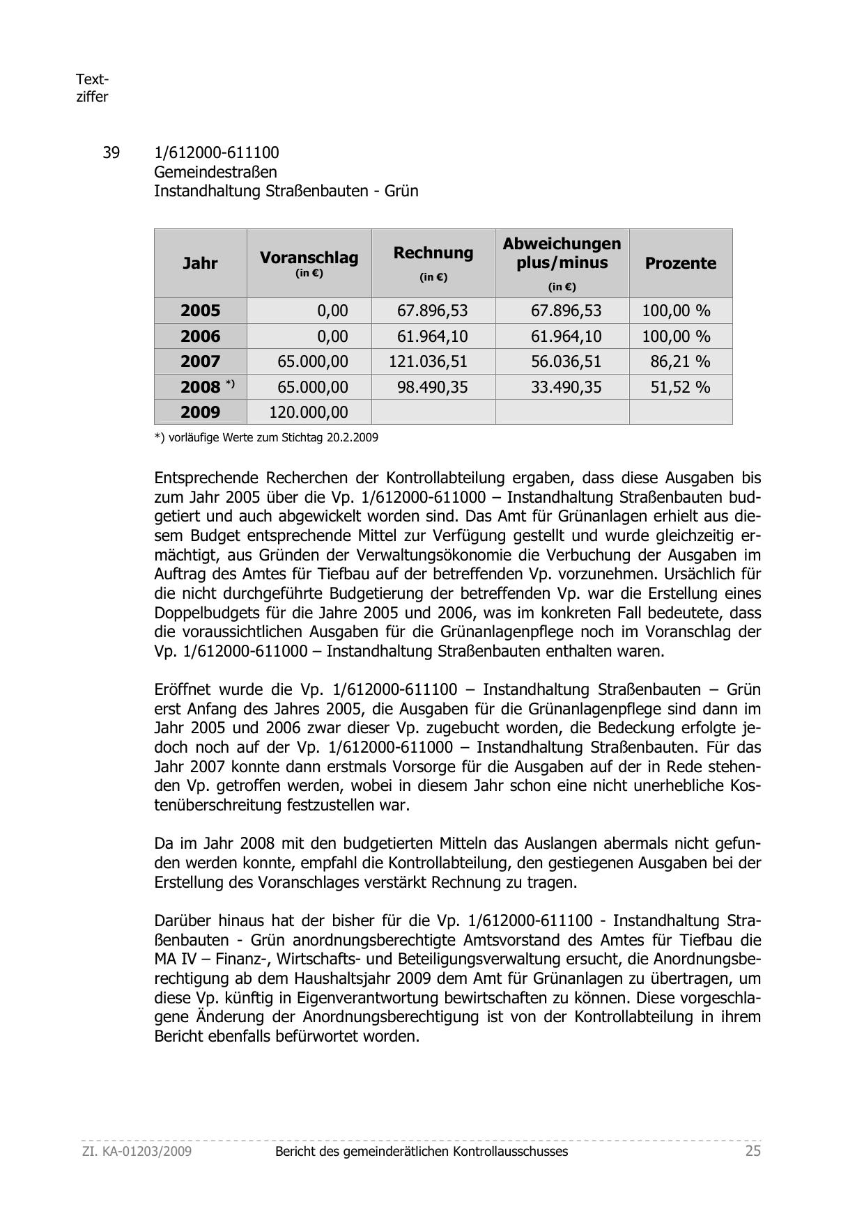 zum Jahr 2005 über die Vp. 1/612000-611000 – Instandhaltung Straßenbauten budgetiert und auch abgewickelt worden sind. Das Amt für Grünanlagen erhielt aus diesem Budget entsprechende Mittel zur Verfügung gestellt und wurde gleichzeitig ermächtigt, aus Gründen der Verwaltungsökonomie die Verbuchung der Ausgaben im