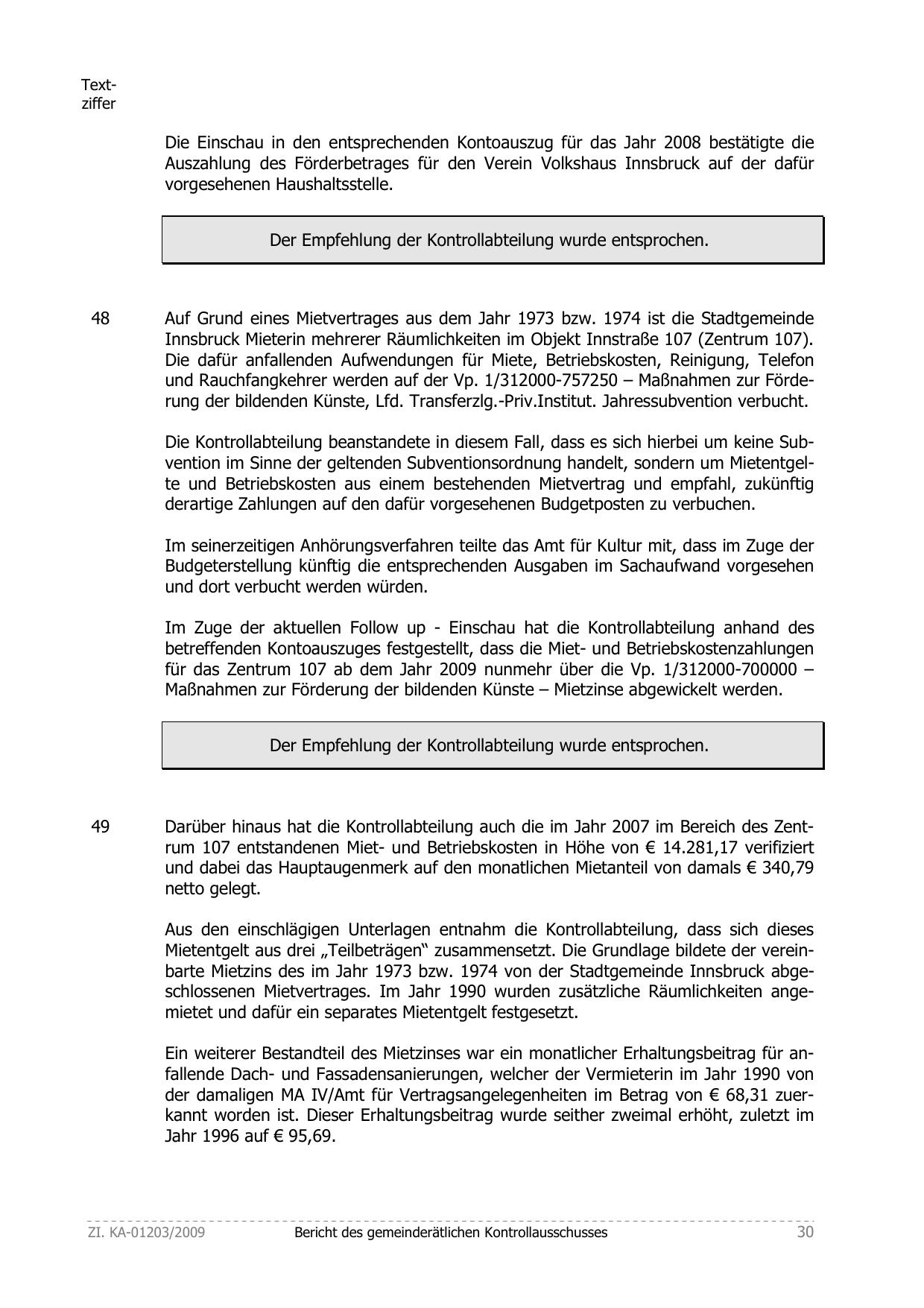 Die Kontrollabteilung beanstandete in diesem Fall, dass es sich hierbei um keine Subvention im Sinne der geltenden Subventionsordnung handelt, sondern um Mietentgelte und Betriebskosten aus einem bestehenden Mietvertrag und empfahl, zukünftig