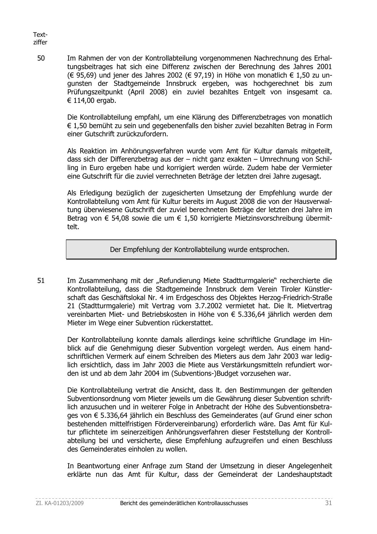 Der Kontrollabteilung konnte damals allerdings keine schriftliche Grundlage im Hinblick auf die Genehmigung dieser Subvention vorgelegt werden. Aus einem handschriftlichen Vermerk auf einem Schreiben des Mieters aus dem Jahr 2003 war lediglich ersichtlich, dass im Jahr 2003 die Miete aus Verstärkungsmitteln refundiert worden ist und ab dem Jahr 2004 im (Subventions-)Budget vorzusehen war.