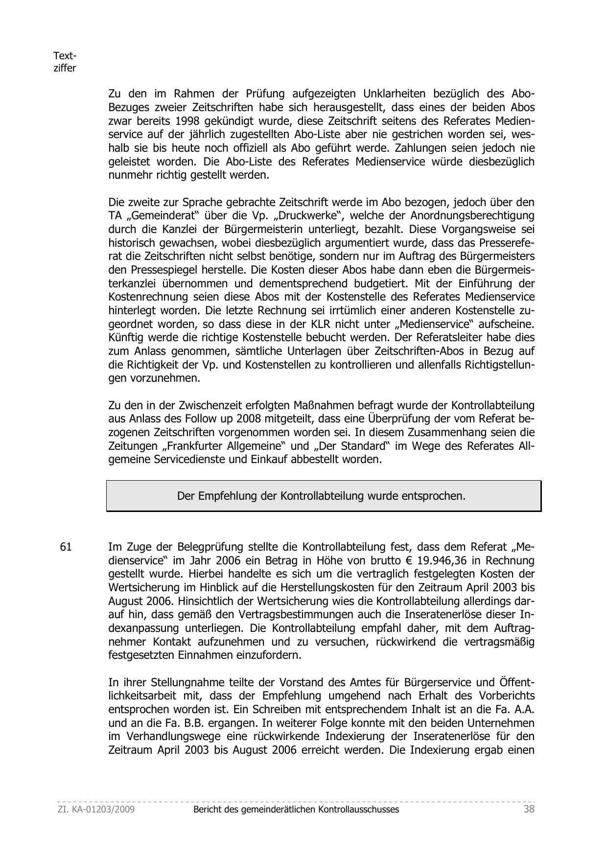 Im Zuge der Belegprüfung stellte die Kontrollabteilung fest, dass dem Referat „Medienservice“ im Jahr 2006 ein Betrag in Höhe von brutto € 19.946,36 in Rechnung