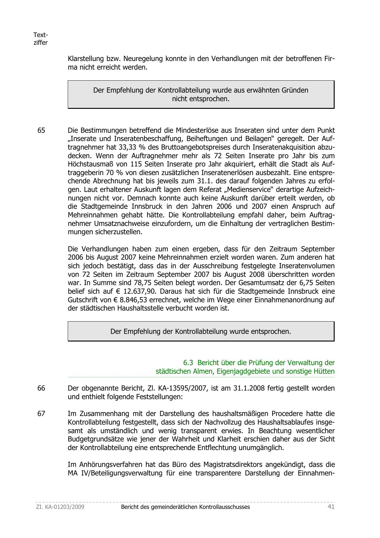 Höchstausmaß von 115 Seiten Inserate pro Jahr akquiriert, erhält die Stadt als Auftraggeberin 70 % von diesen zusätzlichen Inseratenerlösen ausbezahlt. Eine entsprechende Abrechnung hat bis jeweils zum 31.1. des darauf folgenden Jahres zu erfolgen. Laut erhaltener Auskunft lagen dem Referat „Medienservice“ derartige Aufzeichnungen nicht vor. Demnach konnte auch keine Auskunft darüber erteilt werden, ob