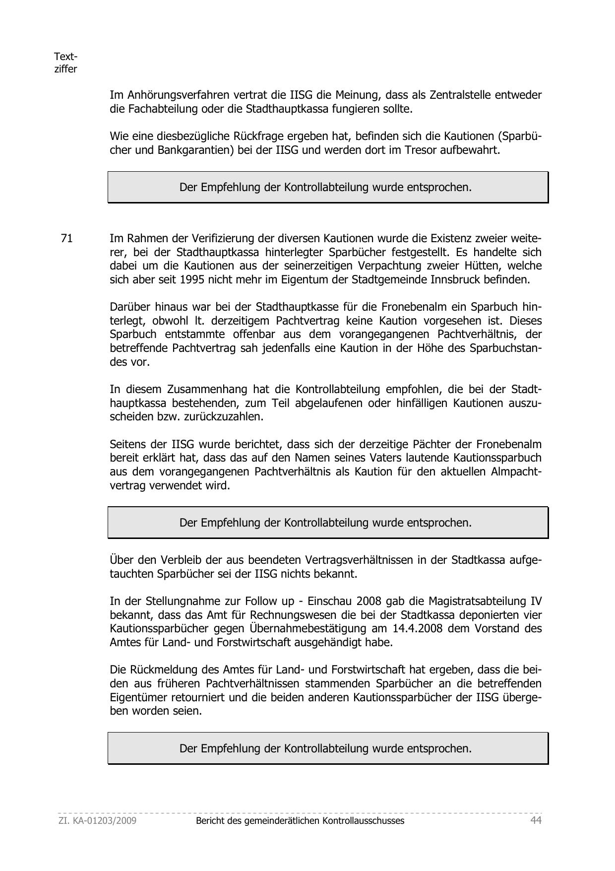 In diesem Zusammenhang hat die Kontrollabteilung empfohlen, die bei der Stadthauptkassa bestehenden, zum Teil abgelaufenen oder hinfälligen Kautionen auszuscheiden bzw. zurückzuzahlen.