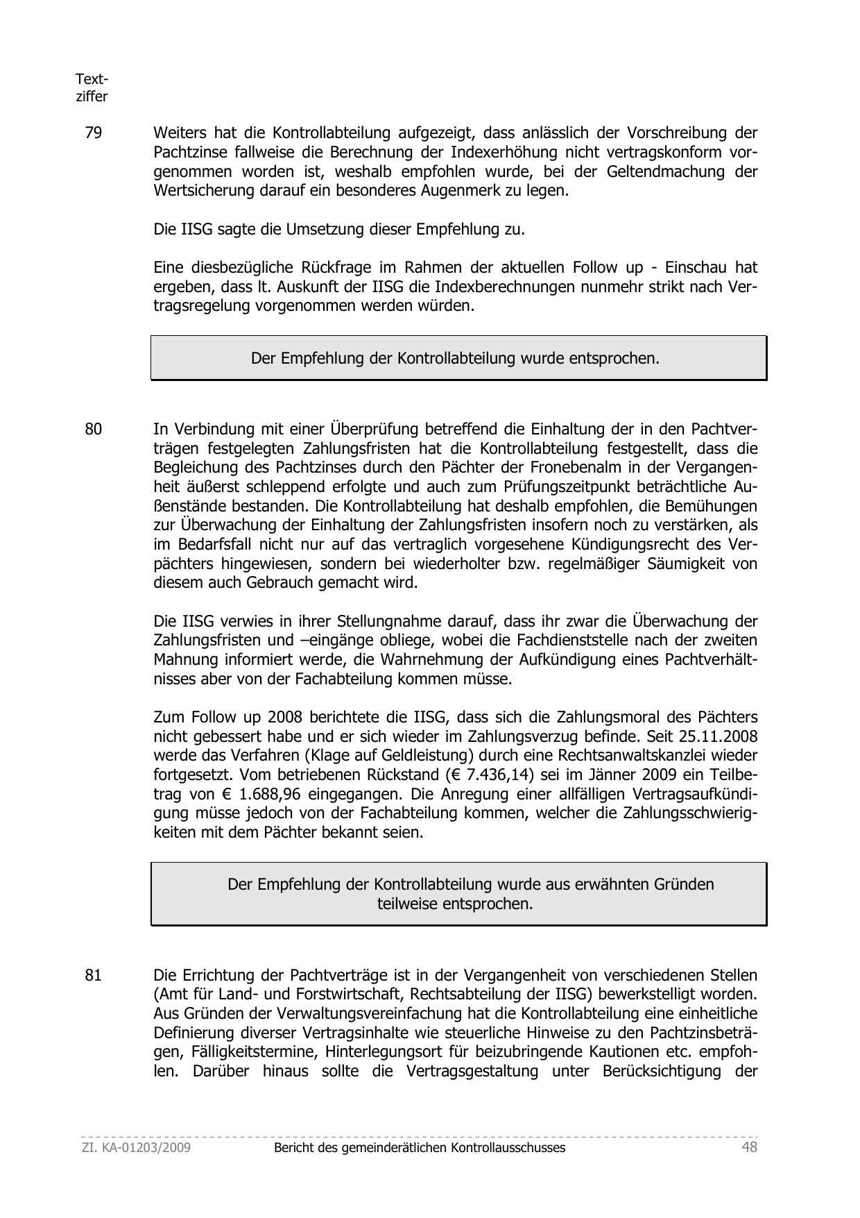 Begleichung des Pachtzinses durch den Pächter der Fronebenalm in der Vergangenheit äußerst schleppend erfolgte und auch zum Prüfungszeitpunkt beträchtliche Außenstände bestanden. Die Kontrollabteilung hat deshalb empfohlen, die Bemühungen