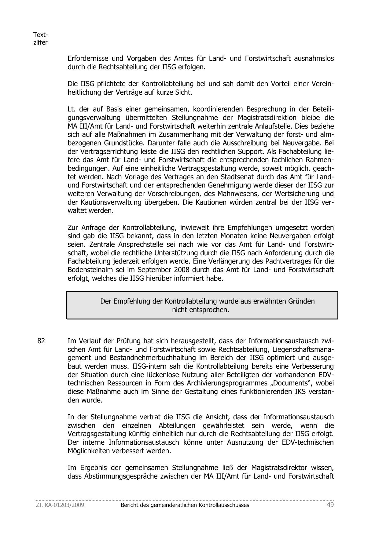 Im Verlauf der Prüfung hat sich herausgestellt, dass der Informationsaustausch zwischen Amt für Land- und Forstwirtschaft sowie Rechtsabteilung, Liegenschaftsmanagement und Bestandnehmerbuchhaltung im Bereich der IISG optimiert und ausgebaut werden muss. IISG-intern sah die Kontrollabteilung bereits eine Verbesserung