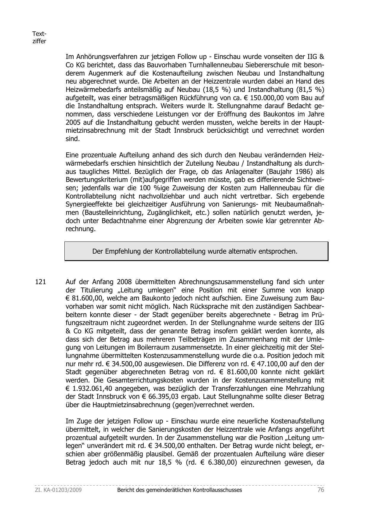 € 81.600,00, welche am Baukonto jedoch nicht aufschien. Eine Zuweisung zum Bauvorhaben war somit nicht möglich. Nach Rücksprache mit den zuständigen Sachbearbeitern konnte dieser - der Stadt gegenüber bereits abgerechnete - Betrag im Prüfungszeitraum nicht zugeordnet werden. In der Stellungnahme wurde seitens der IIG