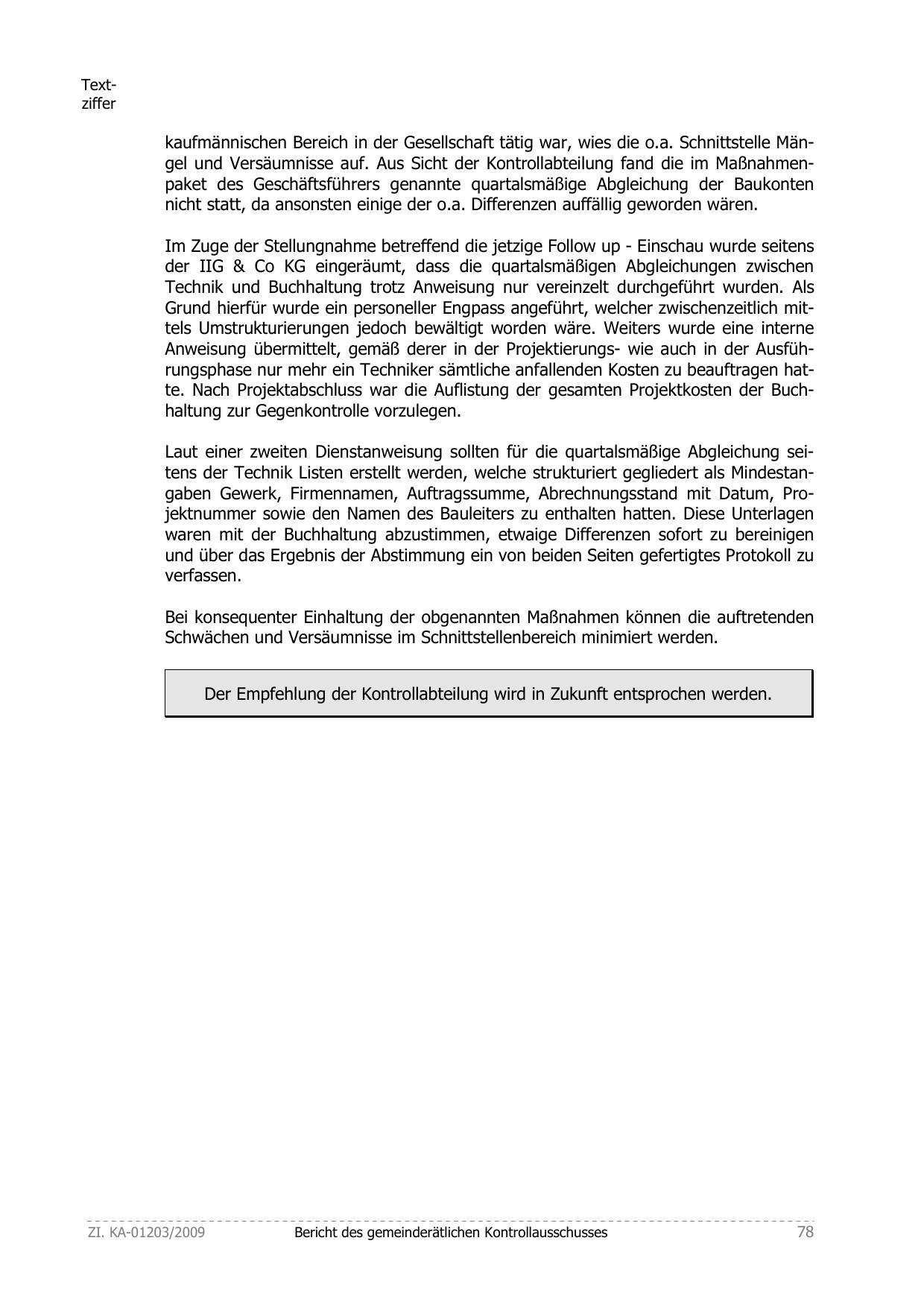 kaufmännischen Bereich in der Gesellschaft tätig war, wies die o.a. Schnittstelle Mängel und Versäumnisse auf. Aus Sicht der Kontrollabteilung fand die im Maßnahmenpaket des Geschäftsführers genannte quartalsmäßige Abgleichung der Baukonten