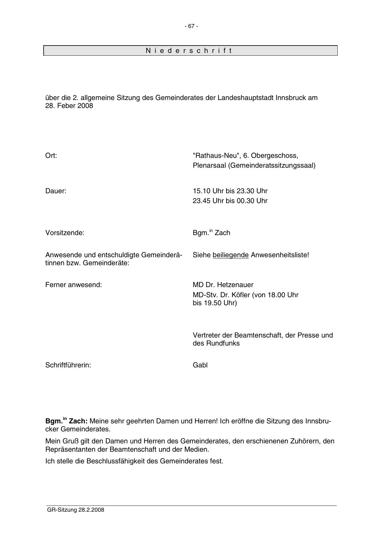 Bgm.in Zach: Meine sehr geehrten Damen und Herren! Ich eröffne die Sitzung des Innsbrucker Gemeinderates.