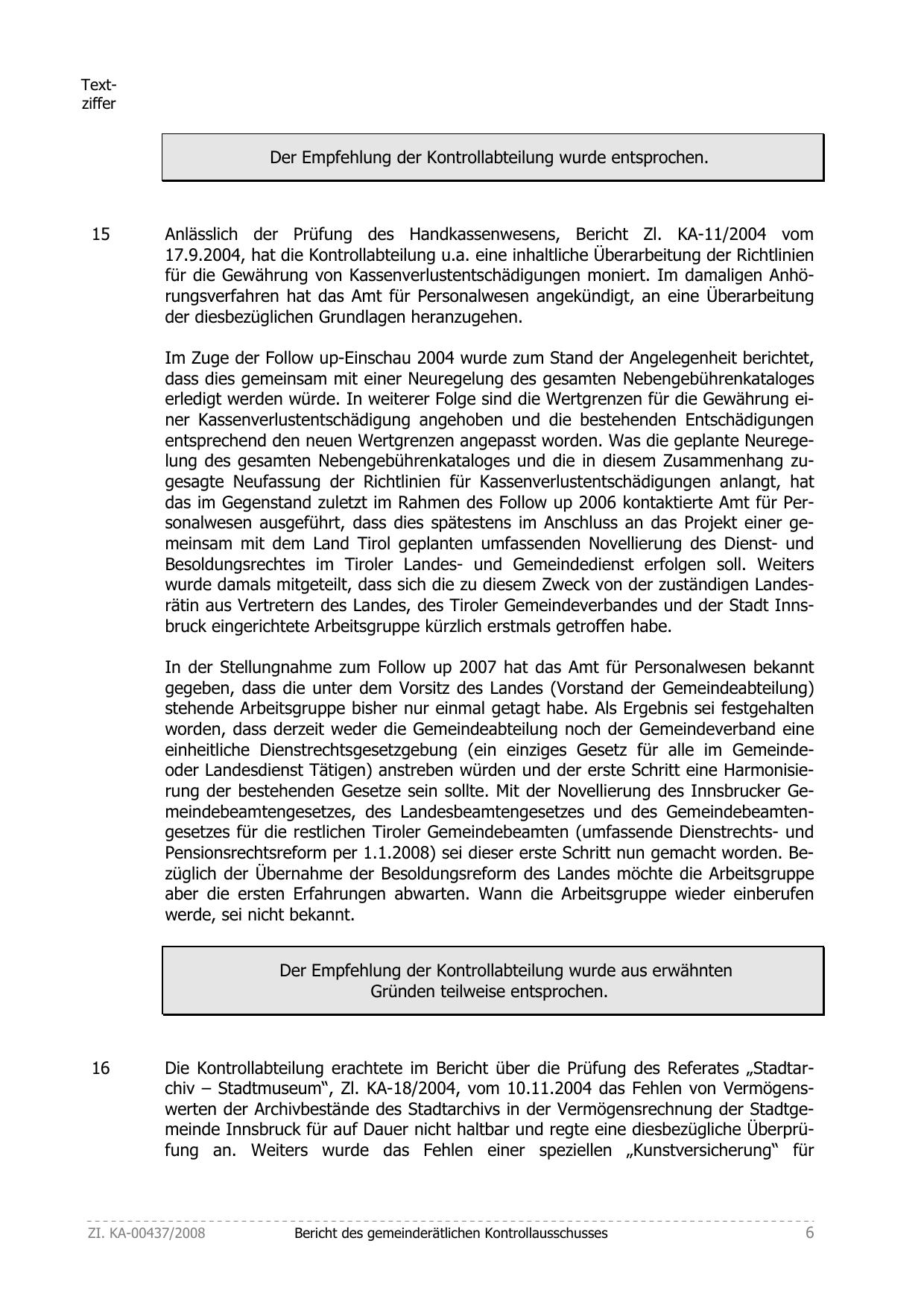 das im Gegenstand zuletzt im Rahmen des Follow up 2006 kontaktierte Amt für Personalwesen ausgeführt, dass dies spätestens im Anschluss an das Projekt einer gemeinsam mit dem Land Tirol geplanten umfassenden Novellierung des Dienst- und