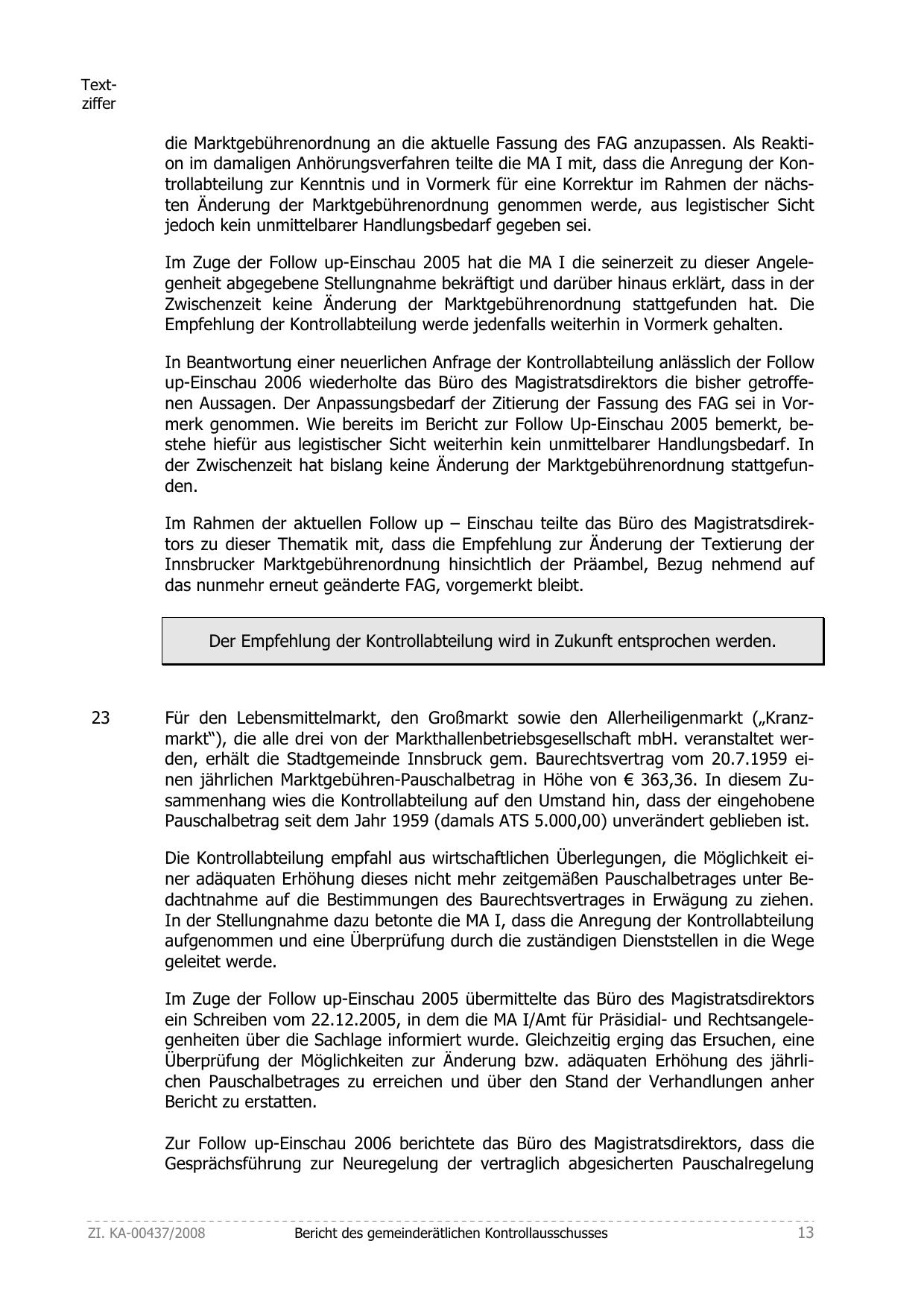 Für den Lebensmittelmarkt, den Großmarkt sowie den Allerheiligenmarkt („Kranzmarkt“), die alle drei von der Markthallenbetriebsgesellschaft mbH. veranstaltet werden, erhält die Stadtgemeinde Innsbruck gem. Baurechtsvertrag vom 20.7.1959 einen jährlichen Marktgebühren-Pauschalbetrag in Höhe von € 363,36. In diesem Zusammenhang wies die Kontrollabteilung auf den Umstand hin, dass der eingehobene